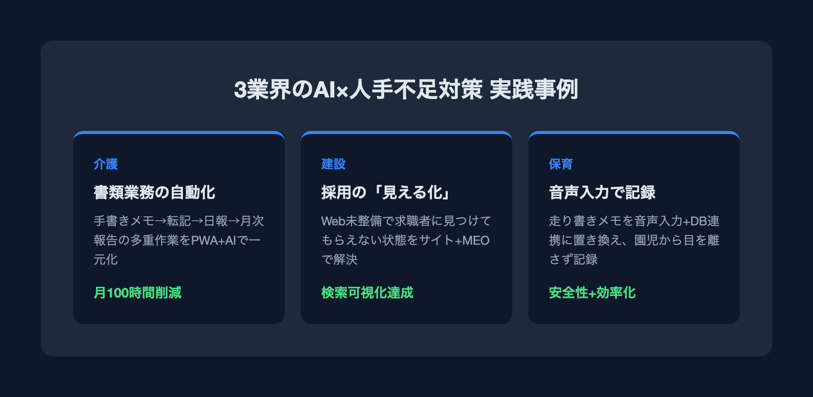 AI 人手不足 対策というテーマで、私が実際に関わった介護・建設・保育の3業界での取り組みをご紹介します。「人を増やす」のではなく「業務を減らす」アプローチで、現場の負担を大幅に軽減できた実体験です。