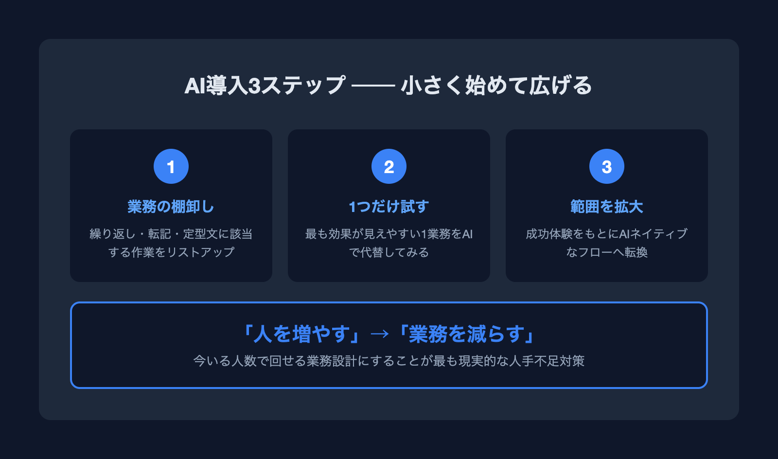 こうした状況で私が実践してきたのは、「今いる人数で回せる業務設計にする」というアプローチです。AIを活用して業務そのものを削減することで、採用できなくても現場が機能する状態を作る。この発想の転換が、3業界での取り組みで共通していました。