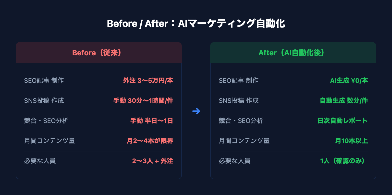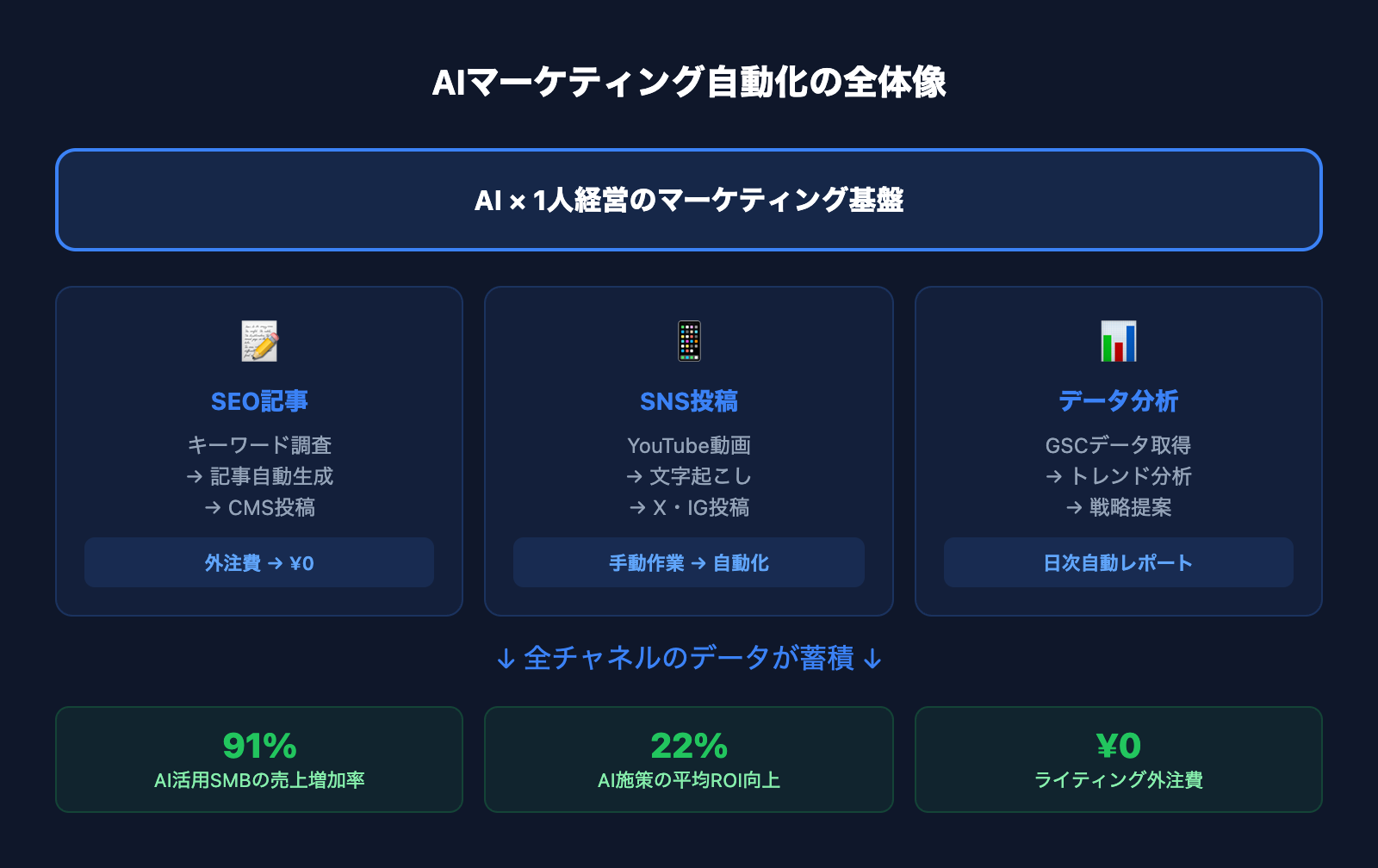 私は法人3期目・基本1人経営の中で、SEO記事・SNS投稿・競合分析・営業資料作成をAIで自動化しています。ライティング外注費はゼロ、月間コンテンツ量は以前の3倍以上です。