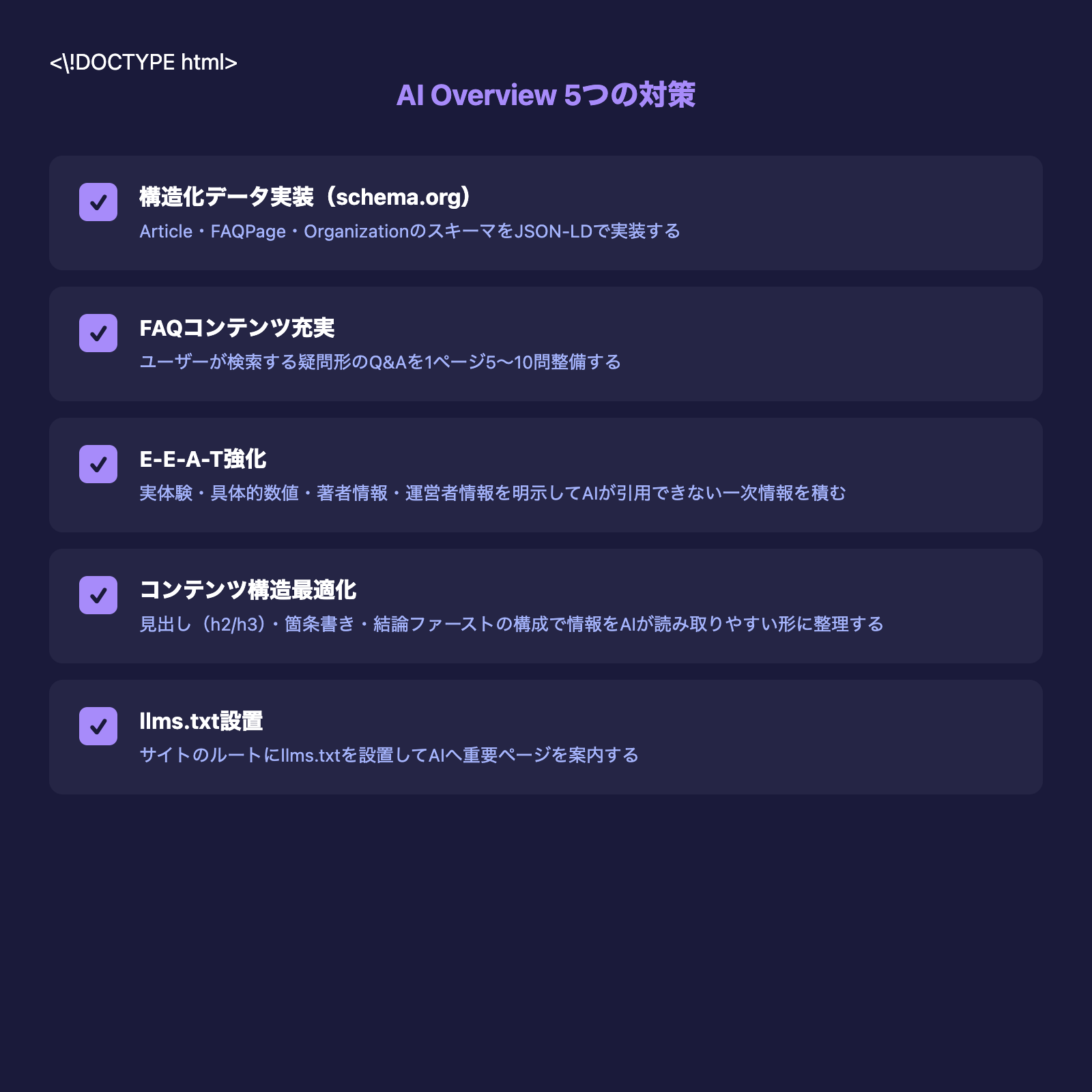 Googleの検索アルゴリズムとAI Overviewの引用ロジックは別物ですが、AIがサイトの情報を正確に把握できる環境を整えておくことは、あらゆるAI検索への対策として有効です。