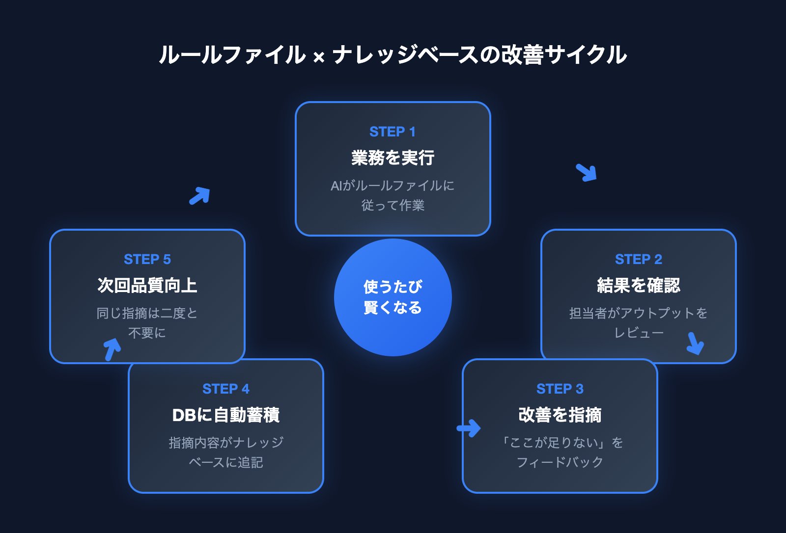 ルールファイルが「最初のルール設定」なら、ナレッジベースは「運用しながら知見が蓄積されていく仕組み」です。ここが既存のマニュアル運用と決定的に違うところです。