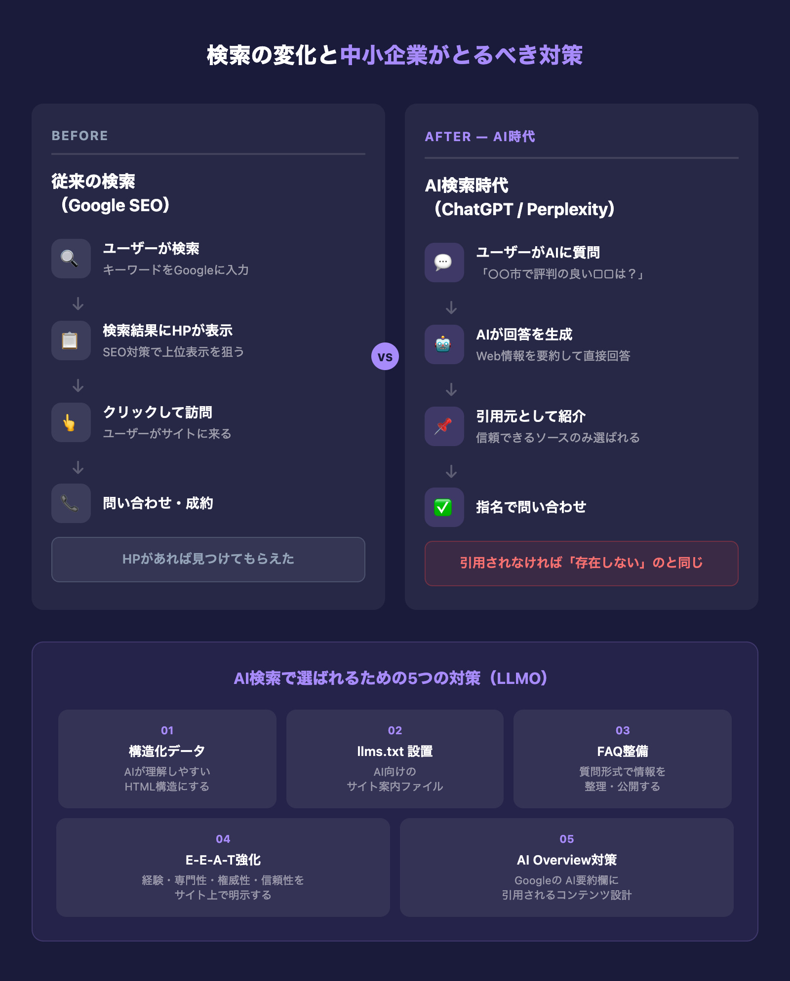 ChatGPTやPerplexityの台頭により、ユーザーの検索行動は劇的に変化しました。この記事では、AI検索時代に中小企業が「存在しない」扱いにならないために今すぐ取り組むべき対策を、実践者の視点で解説します。