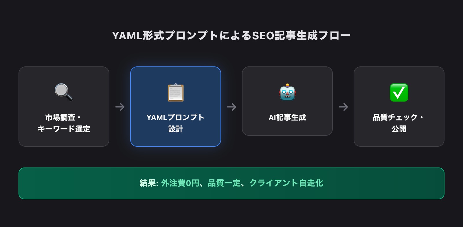 今回は、私が実際にクライアント案件で構築した「YAML形式のプロンプトテンプレートによるSEO記事の品質安定化」の方法をお伝えします。