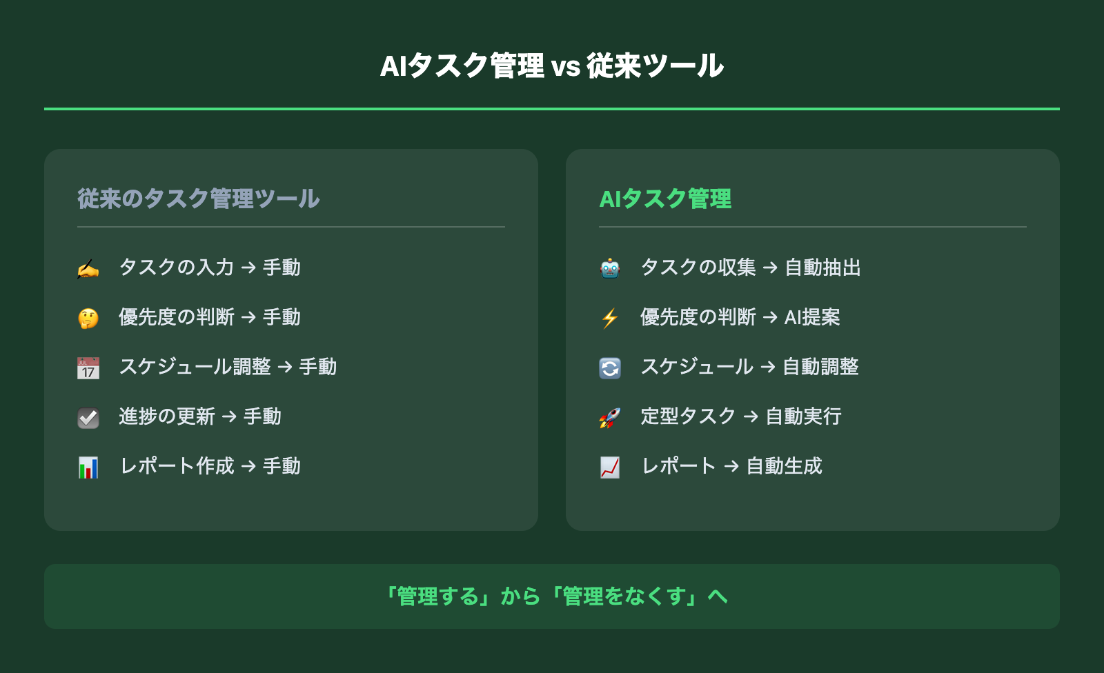 まず、AIによるタスク管理が従来のタスク管理ツールと何が違うのかを整理します。
