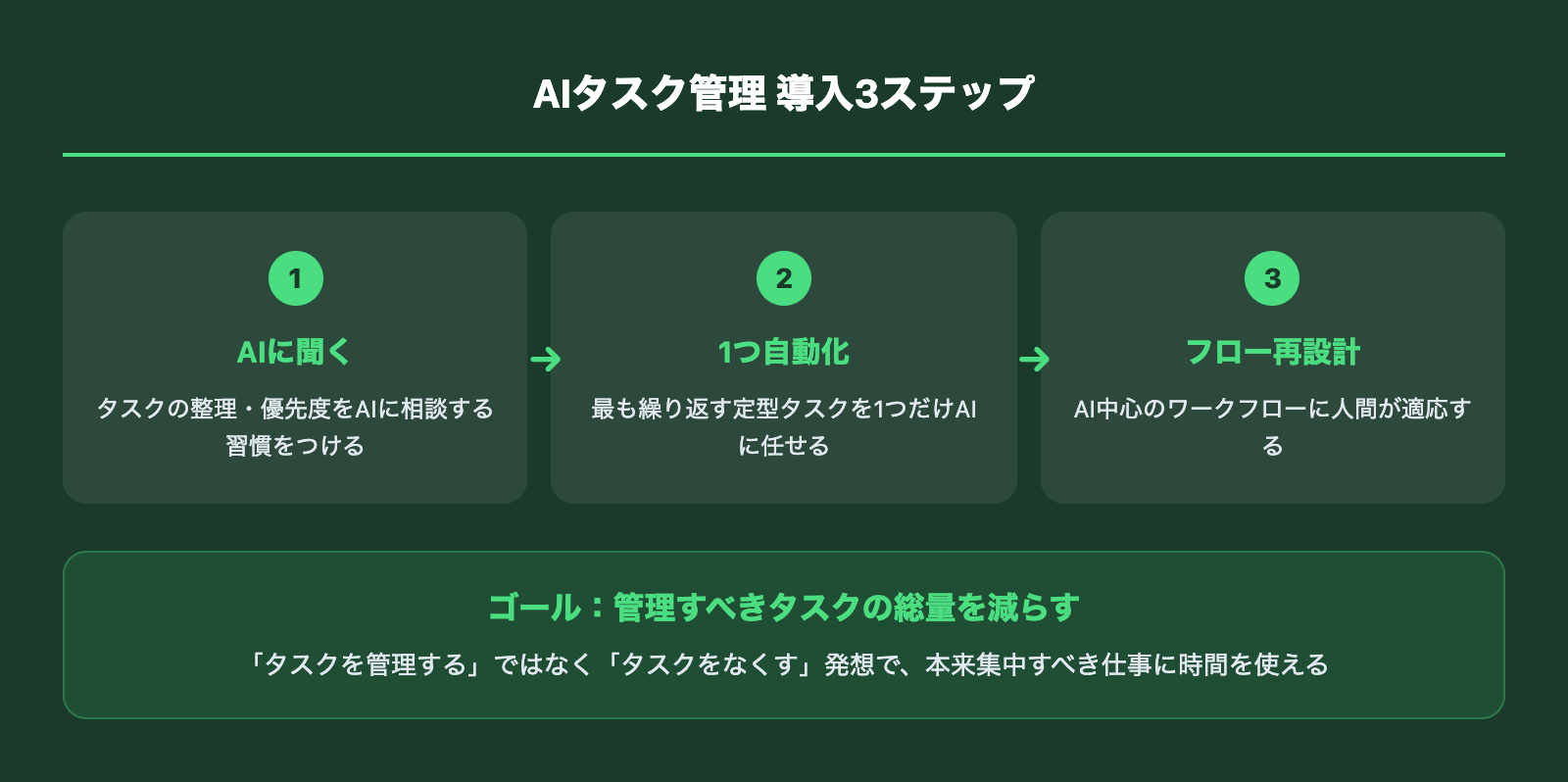 ここで重要なのは、「タスクを管理する」のではなく「タスクをなくす」という発想です。AIが自動実行できるタスクは、そもそもタスク管理の対象から外れます。管理すべきタスクの総量を減らすことが、最も効果的なタスク管理です。