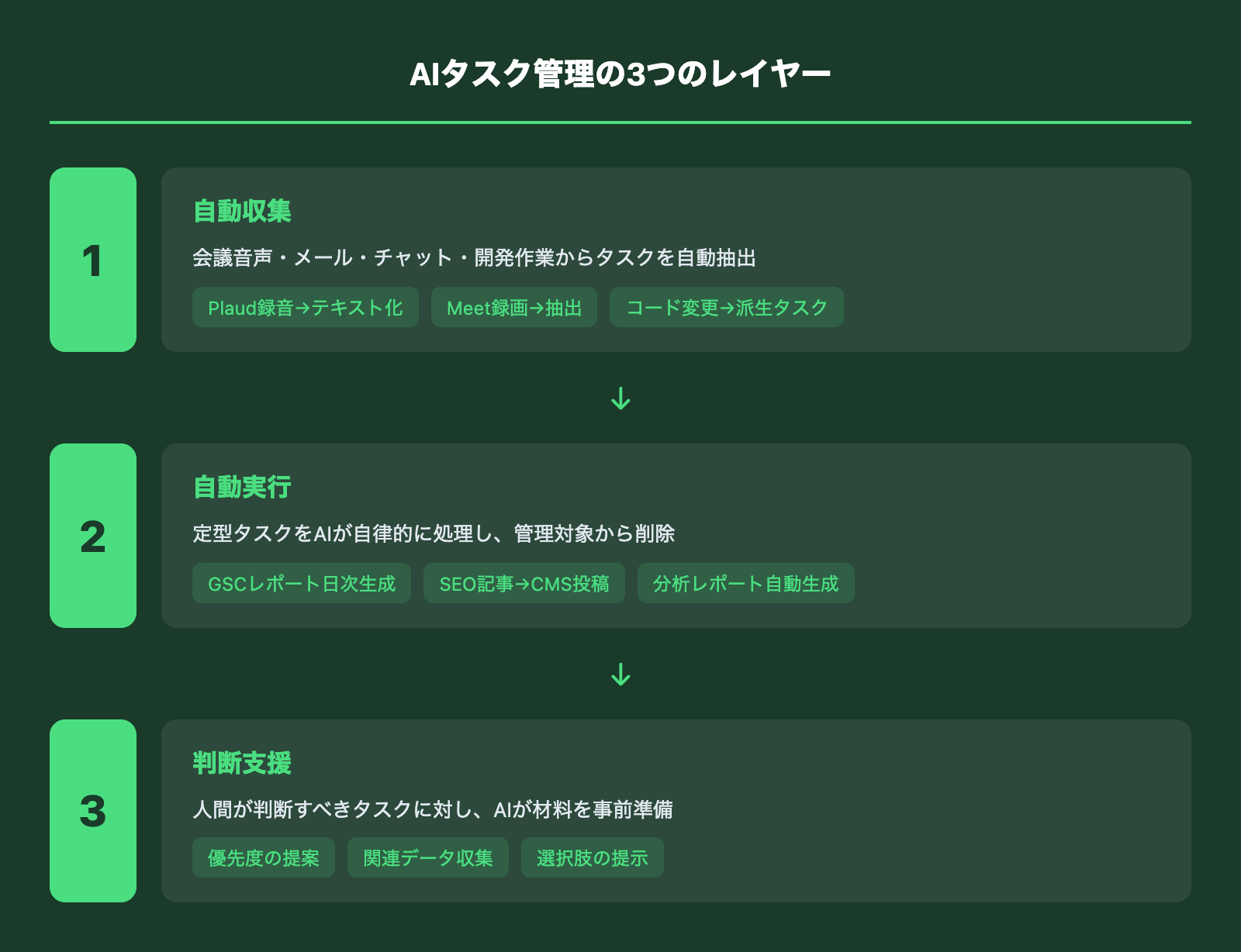 私が実際に運用しているAIタスク管理は、3つのレイヤーで構成されています。