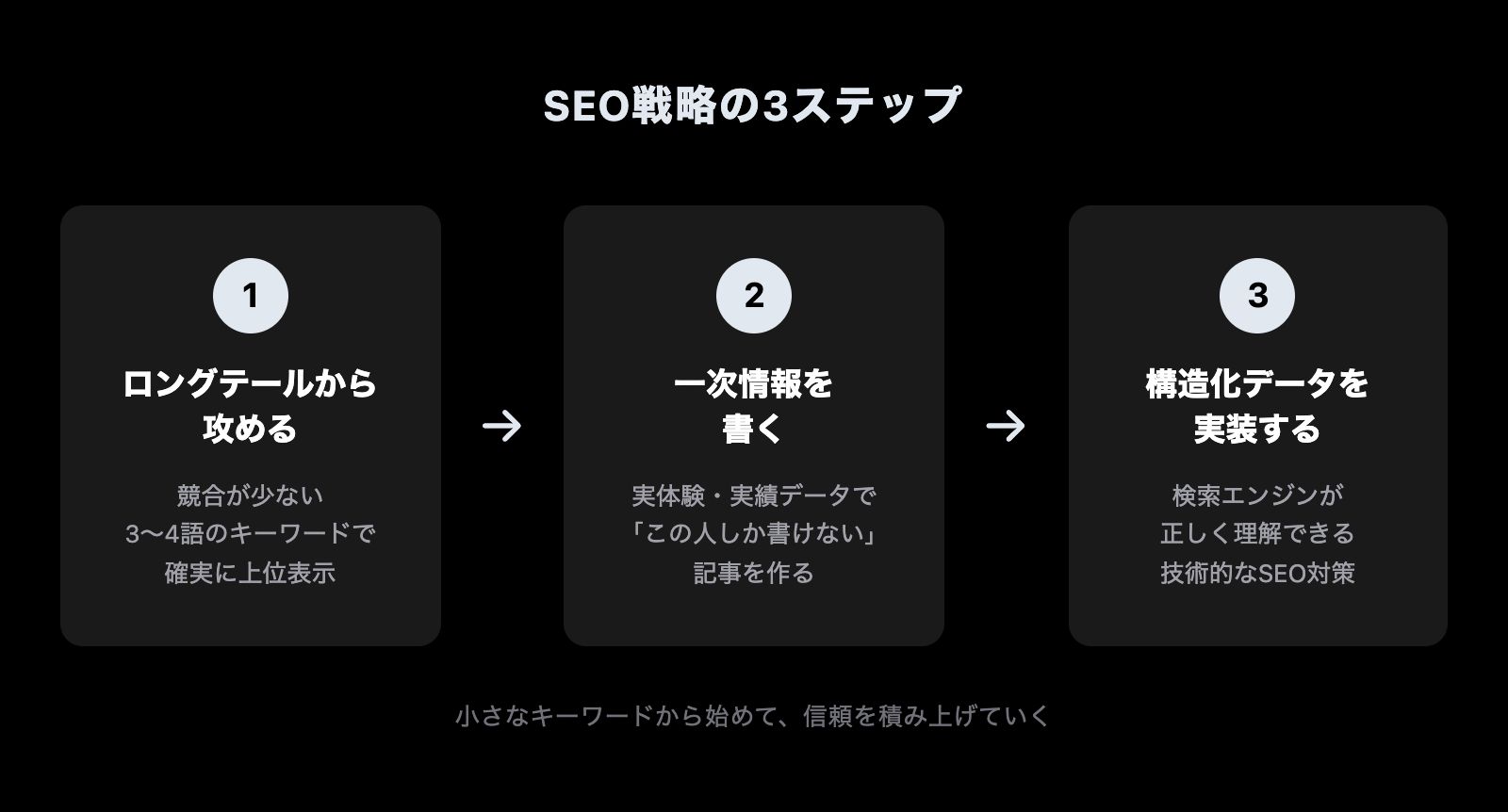 中小企業も同じです。まずは自社の強みに直結するロングテールキーワードを5〜10個リストアップし、それぞれに対して1記事ずつ書いていくことから始めてください。