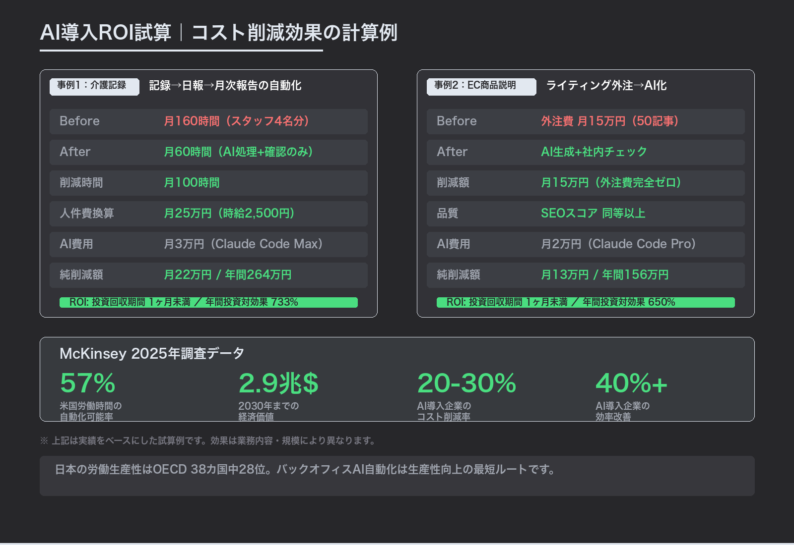 AI導入企業では20〜30%のコスト削減、40%以上の効率改善が報告されています。特にバックオフィスは、営業や企画と違って「正確に・素早く・ミスなく」が求められる領域であり、AIが最も得意とする仕事です。