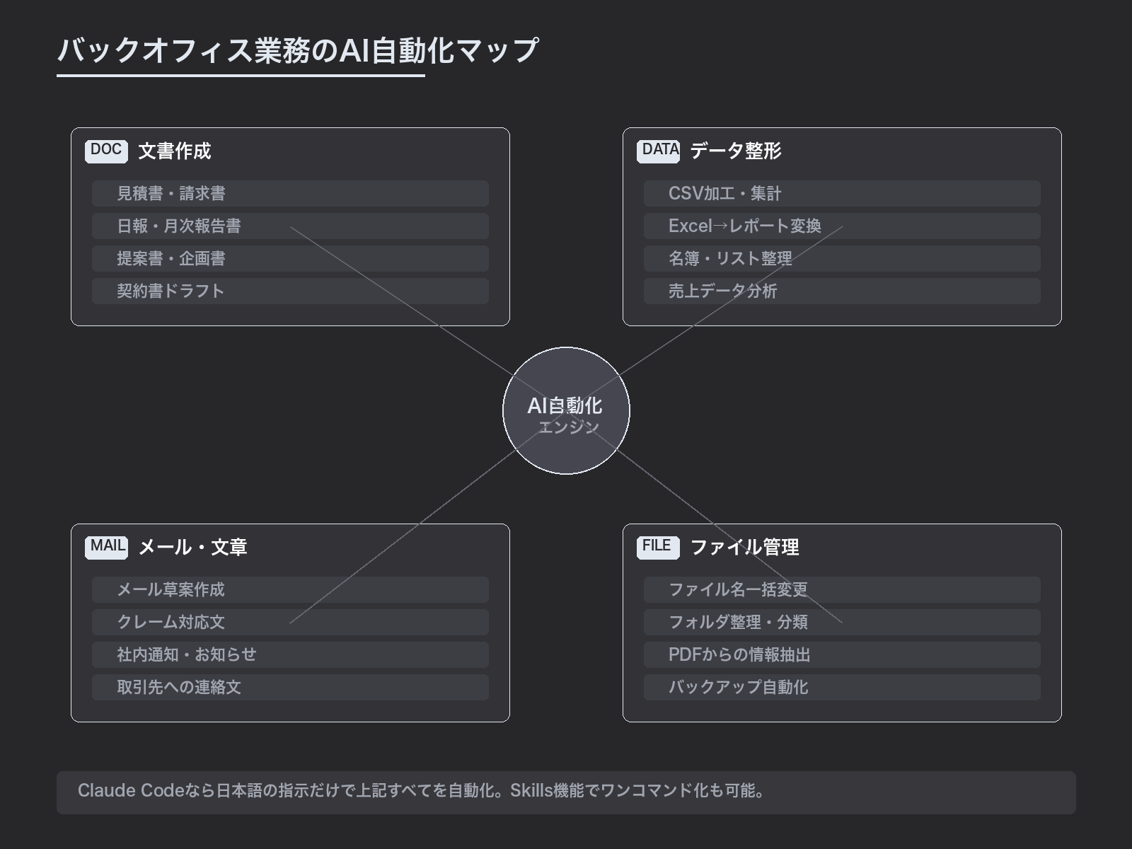 上記の事例は氷山の一角です。Claude Codeで自動化できるバックオフィス業務は多岐にわたります。
