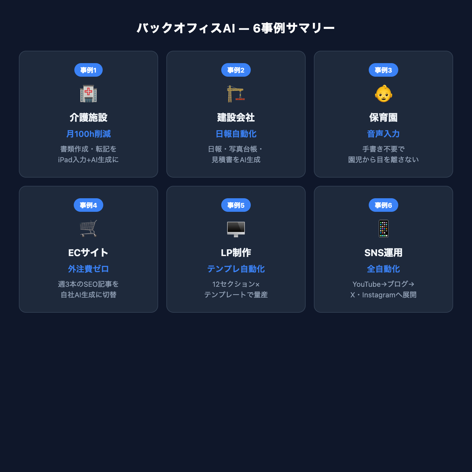 バックオフィスAIで最も効果が出るのは「同じ情報を別のフォーマットに書き写す」転記作業です。介護施設の月100時間削減も、保育園の音声入力も、ECサイトの記事生成も、根本は「転記をなくす」というアプローチです。