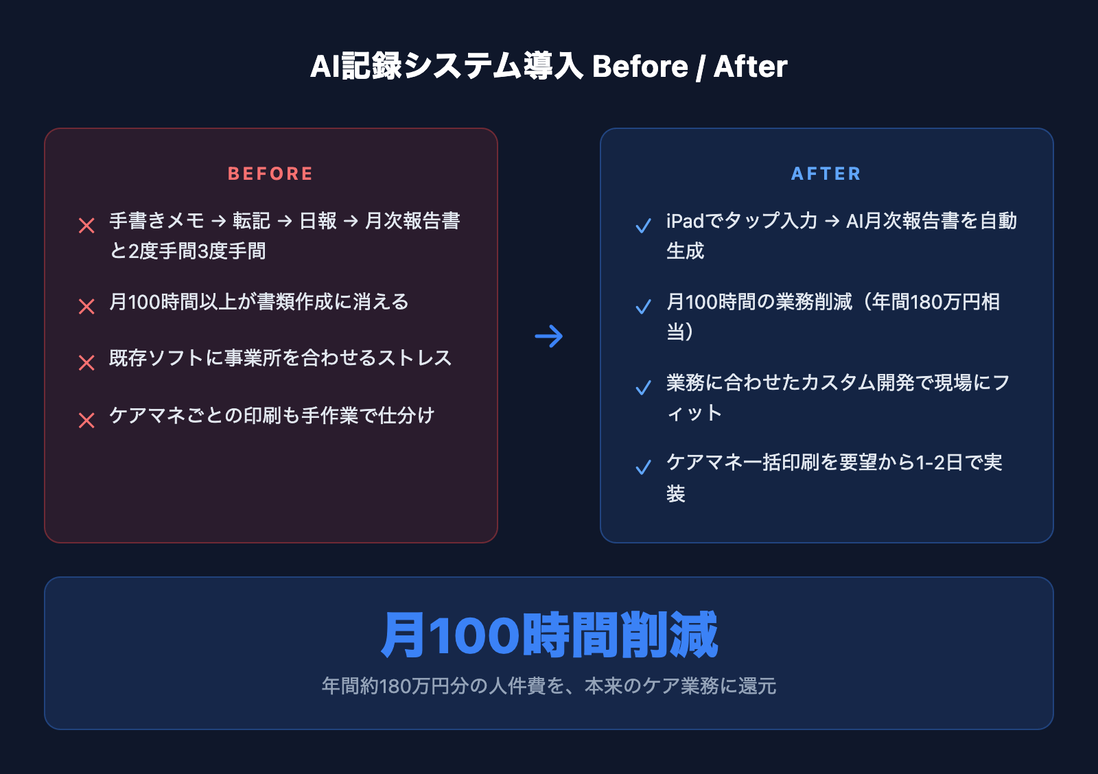 関連記事: 介護記録の月次報告書、AIで自動作成したら月100時間削減できた話