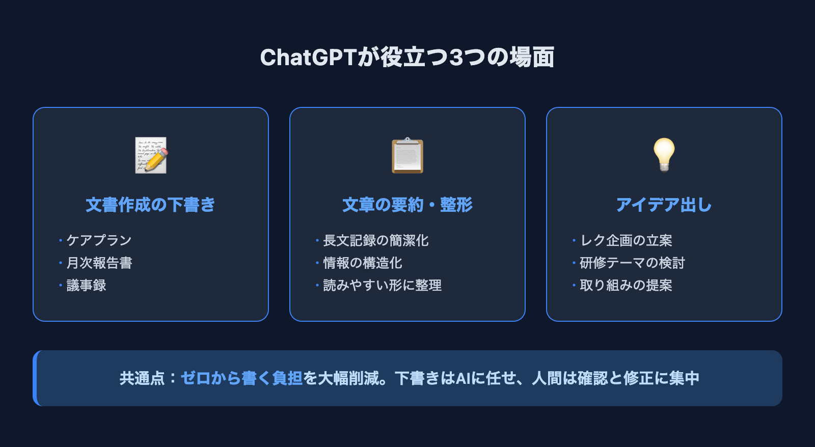 共通しているのは、「ゼロから文章を書く」負担を大幅に減らせるということです。下書きをChatGPTに任せ、人間は内容の確認と修正に集中する。この使い方が介護現場には最もフィットします。