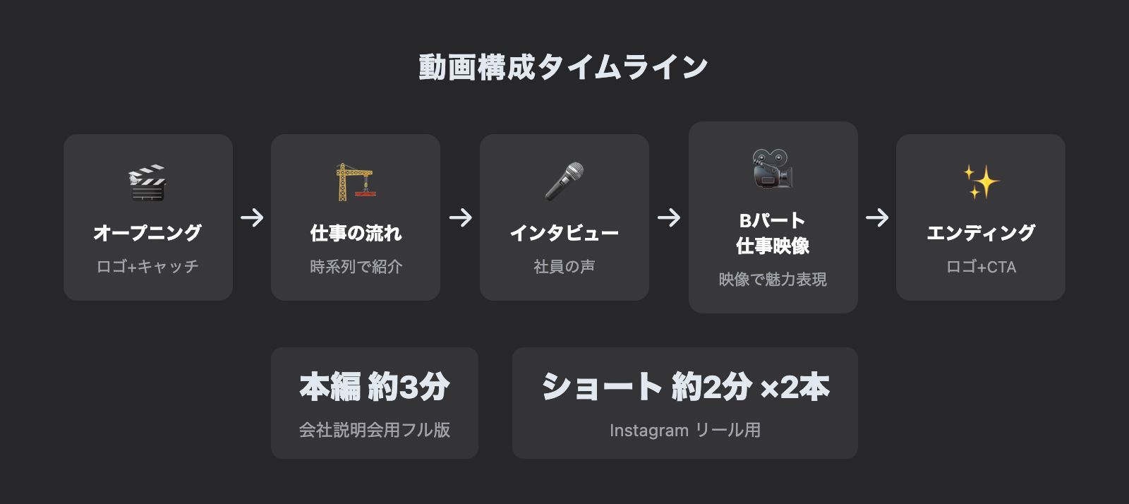 30万円で本編1本+ショート版2本。会社説明会にもInstagramにも使える。これは、建設業の中小企業にとって非常にコストパフォーマンスの高い選択肢ではないでしょうか。