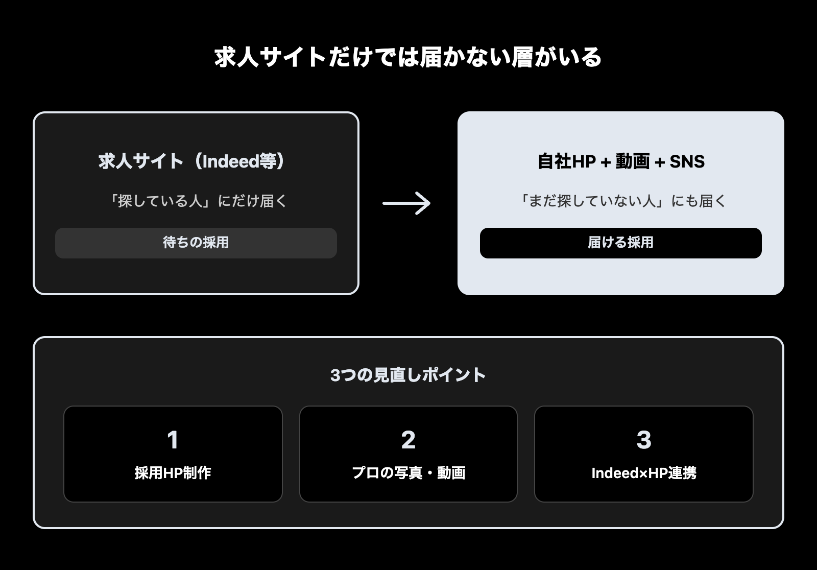 求人サイトへの掲載は、基本的に「応募が来るのを待つ」スタイルです。有効求人倍率5倍の環境で、他の4社と同じ土俵で待っているだけでは、選ばれる確率は単純計算で20%です。自社から能動的に魅力を発信し、求職者に「この会社で働きたい」と思わせる仕組みがなければ、応募は増えません。