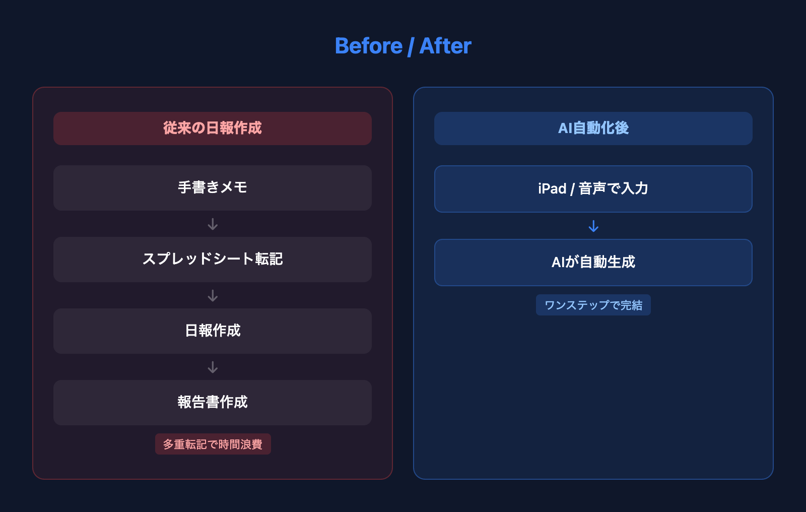 しかも問題は「時間」だけではありません。現場仕事の後に事務所へ戻り、記憶を頼りに日報を書く——この作業が、スタッフのモチベーションを確実に下げています。
