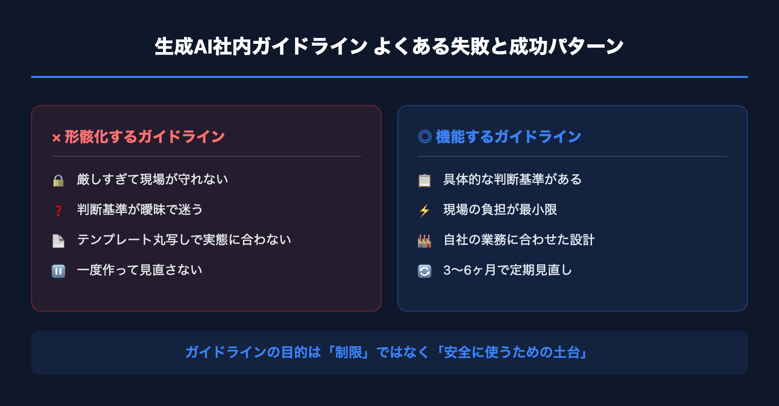 私がクライアントにAI導入支援を行う際、ガイドライン設計で意識しているのは以下の3点です。
