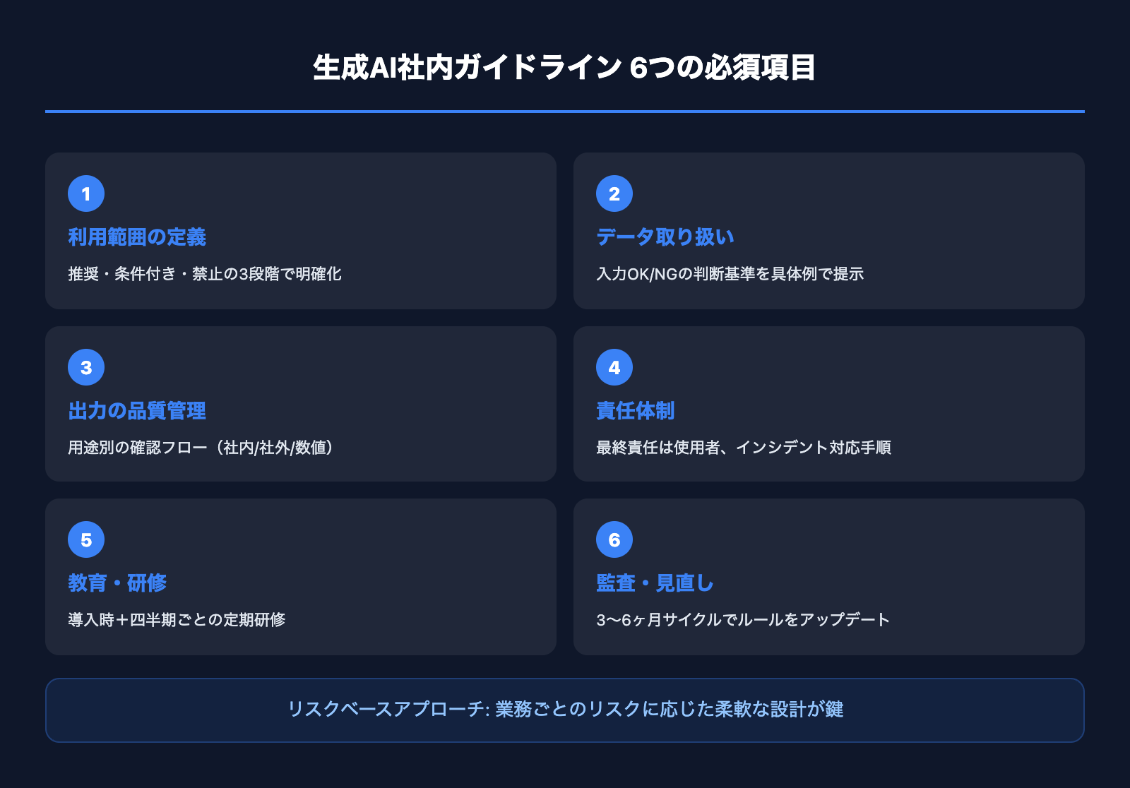 社内ガイドラインは、以下の6項目を軸に設計するのが効果的です。