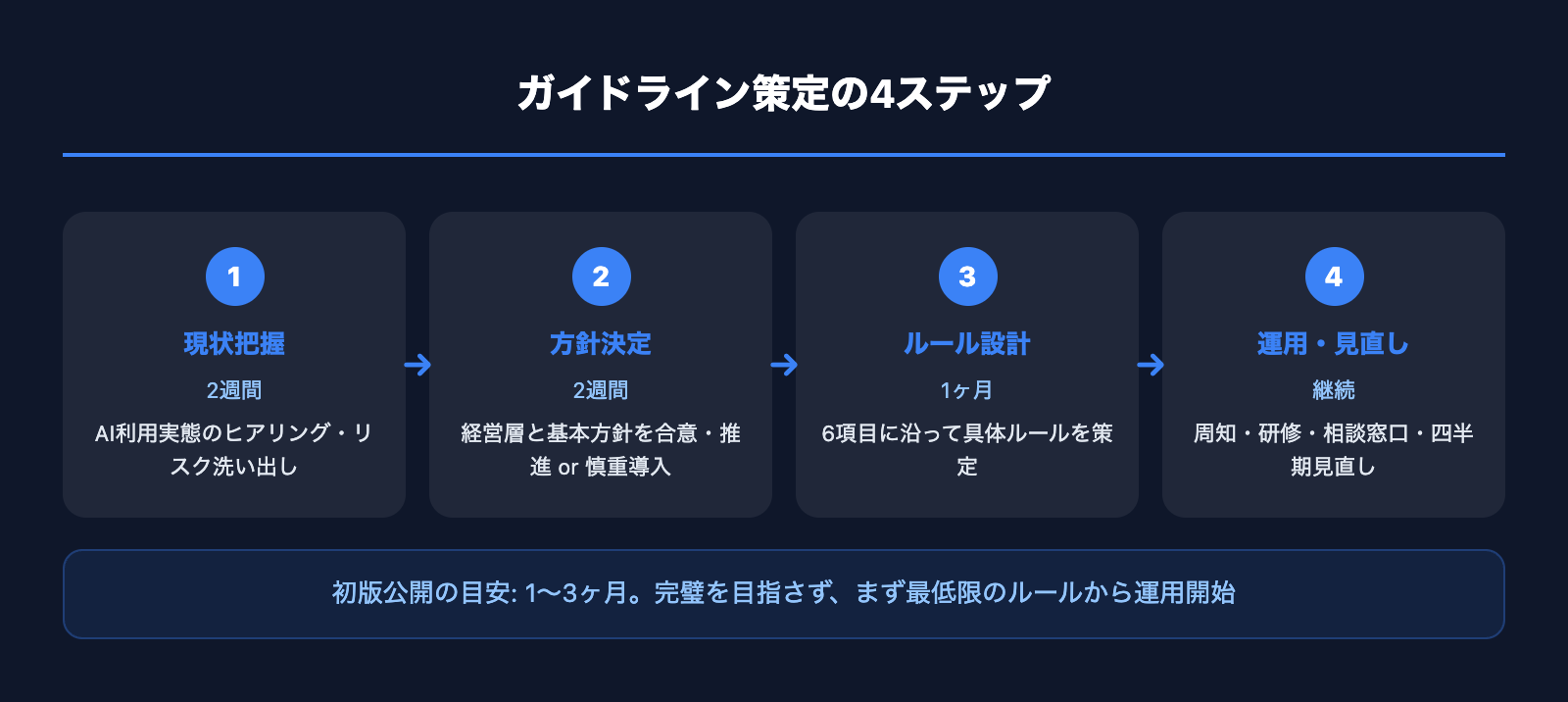 実際にガイドラインを策定する手順を解説します。初版公開までの目安は1〜3ヶ月です。