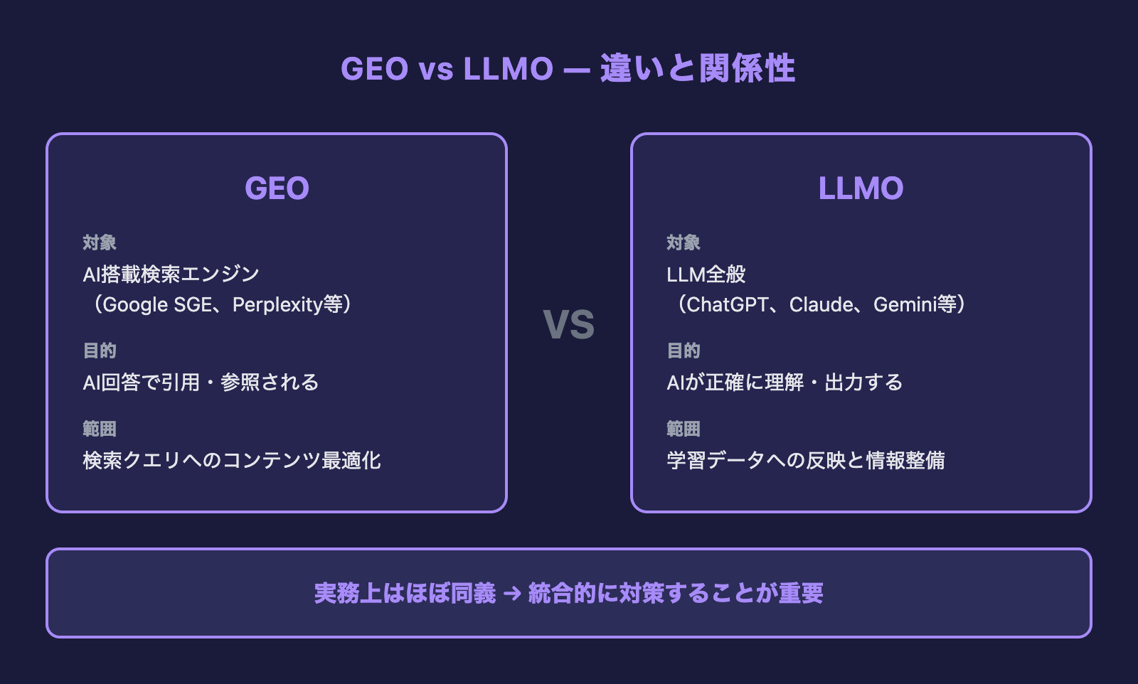 学術的・技術的には上記のような違いがありますが、実務レベルでは「GEO」も「LLMO」もほぼ同じ施策を指します。どちらも「AIに正しく理解され、引用されるコンテンツを作る」ことがゴールだからです。
