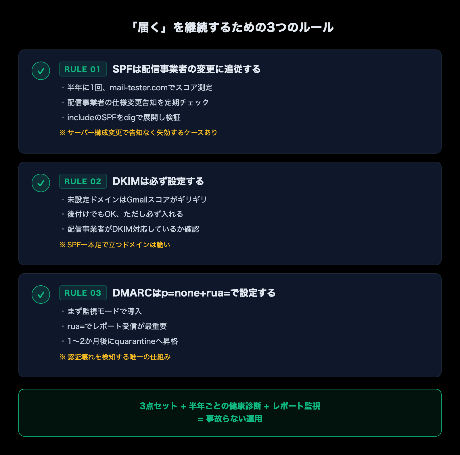 FromドメインとDKIMのd=ドメインが一致しているか確認対応しながら、「どうすれば次の事故を防げるか」を常にセットで考えてきました。私が現在すべての案件で適用しているルールは次の3つです。