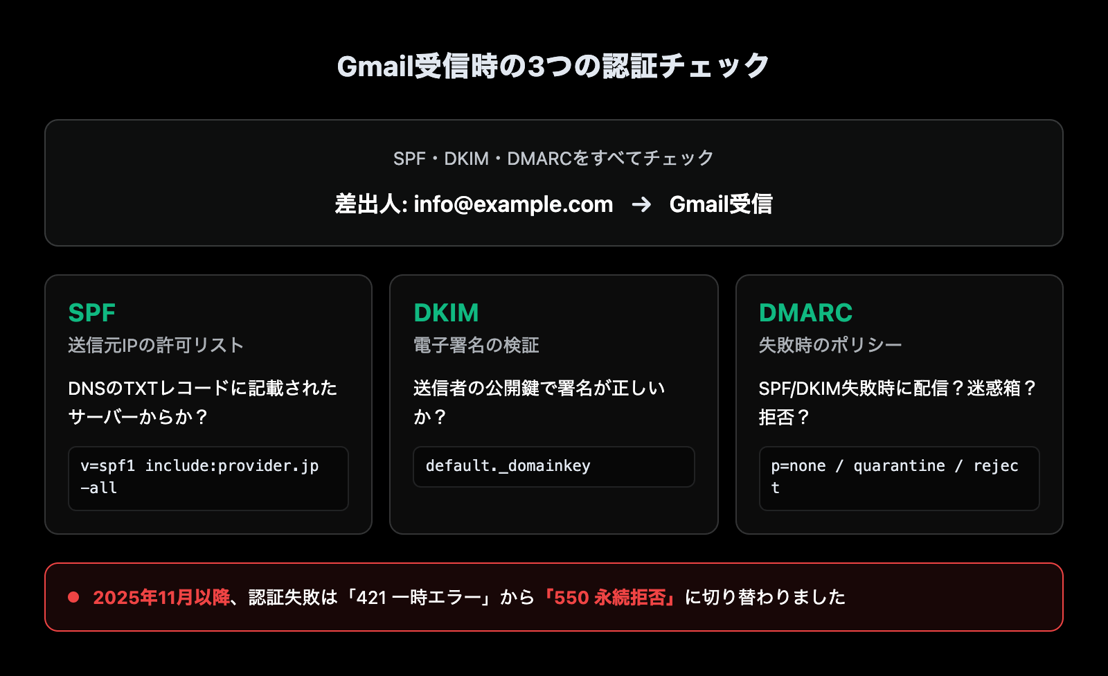 このうち、中小企業に直接影響したのが2025年11月からのハード拒否運用です。それまでは認証がギリギリ失敗していても、Gmail側が寛容に受信してくれていました。それが「即バウンス」に切り替わったため、設定不備のあったドメインが一斉に崖から落ちた、という構図です。