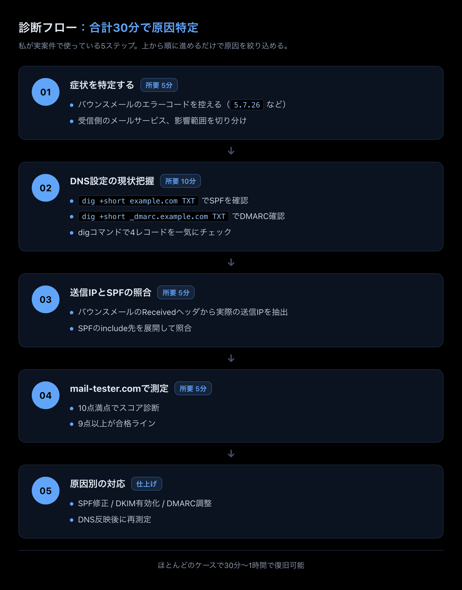 独自ドメインのメールがGmailに急に届かなくなったとき、慌てずに次の順番で当たれば、ほとんどのケースは30分〜1時間で原因が特定できます。