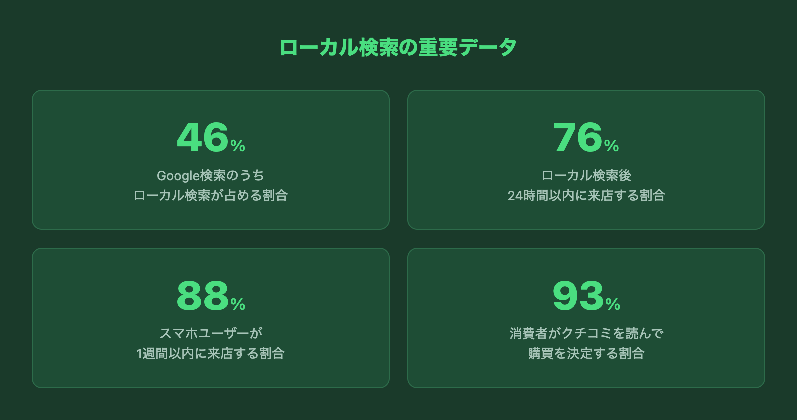 クチコミの数と評価は、ローカル検索の順位に直接影響します。来店されたお客様に「よろしければGoogleでクチコミをいただけると嬉しいです」とお声がけするだけで、クチコミは着実に増えていきます。