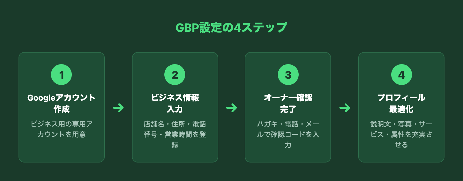GBPの設定は、以下の4ステップで完了します。パソコンでもスマートフォンでも設定可能です。