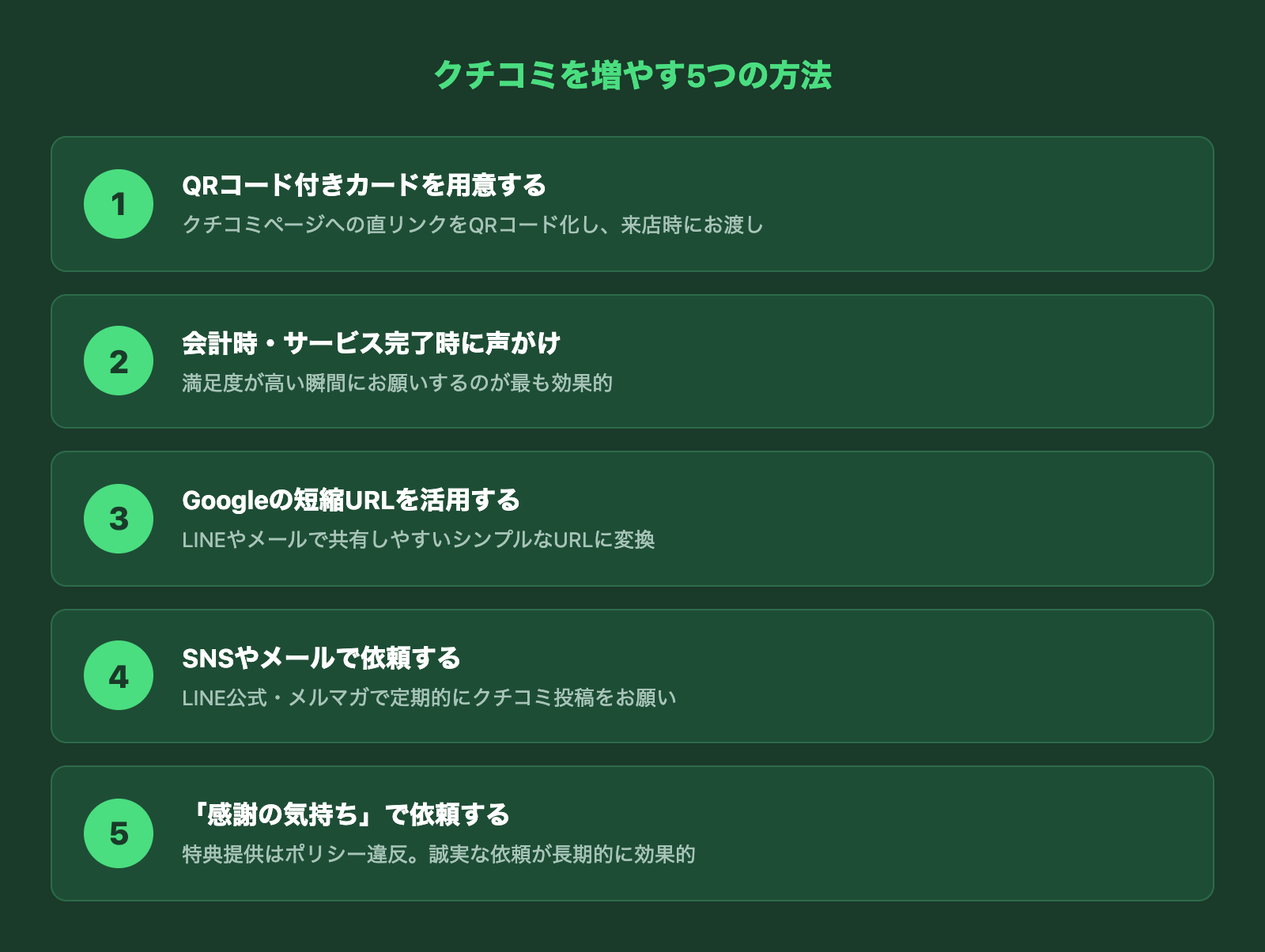 Googleクチコミの増やし方をまとめると、以下のとおりです。