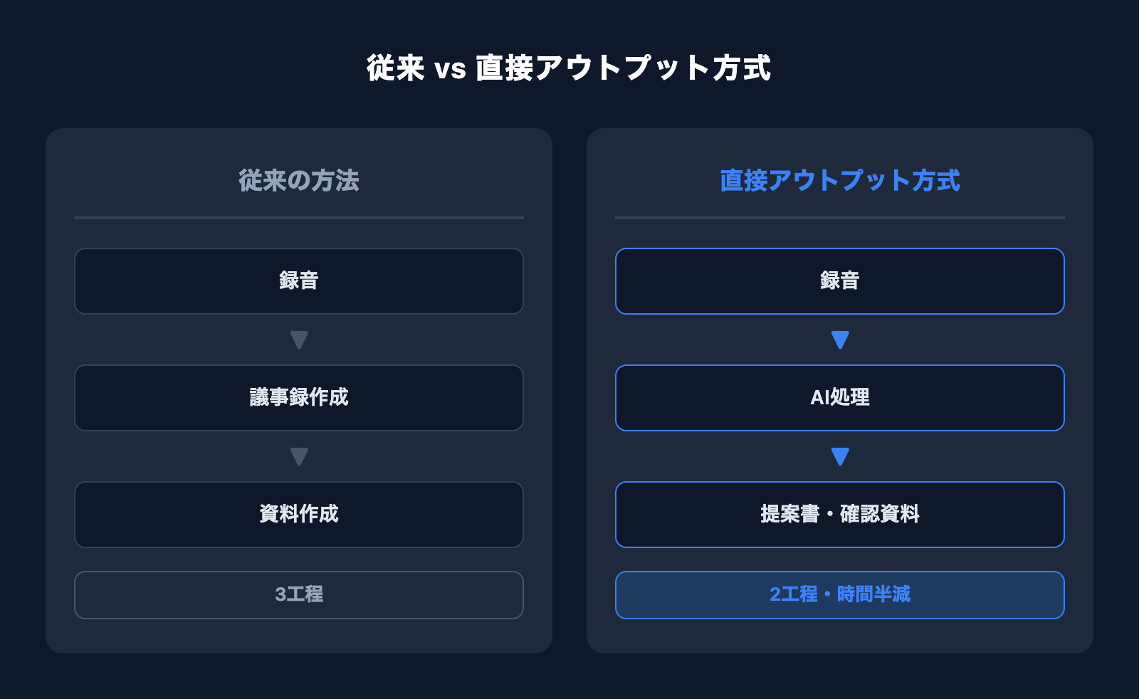 ポイントは「録音→テキスト化→資料生成」が1つの流れでつながっていること。従来の「録音→議事録作成→議事録を見ながら資料作成」という2ステップの工程を、1ステップに圧縮しています。