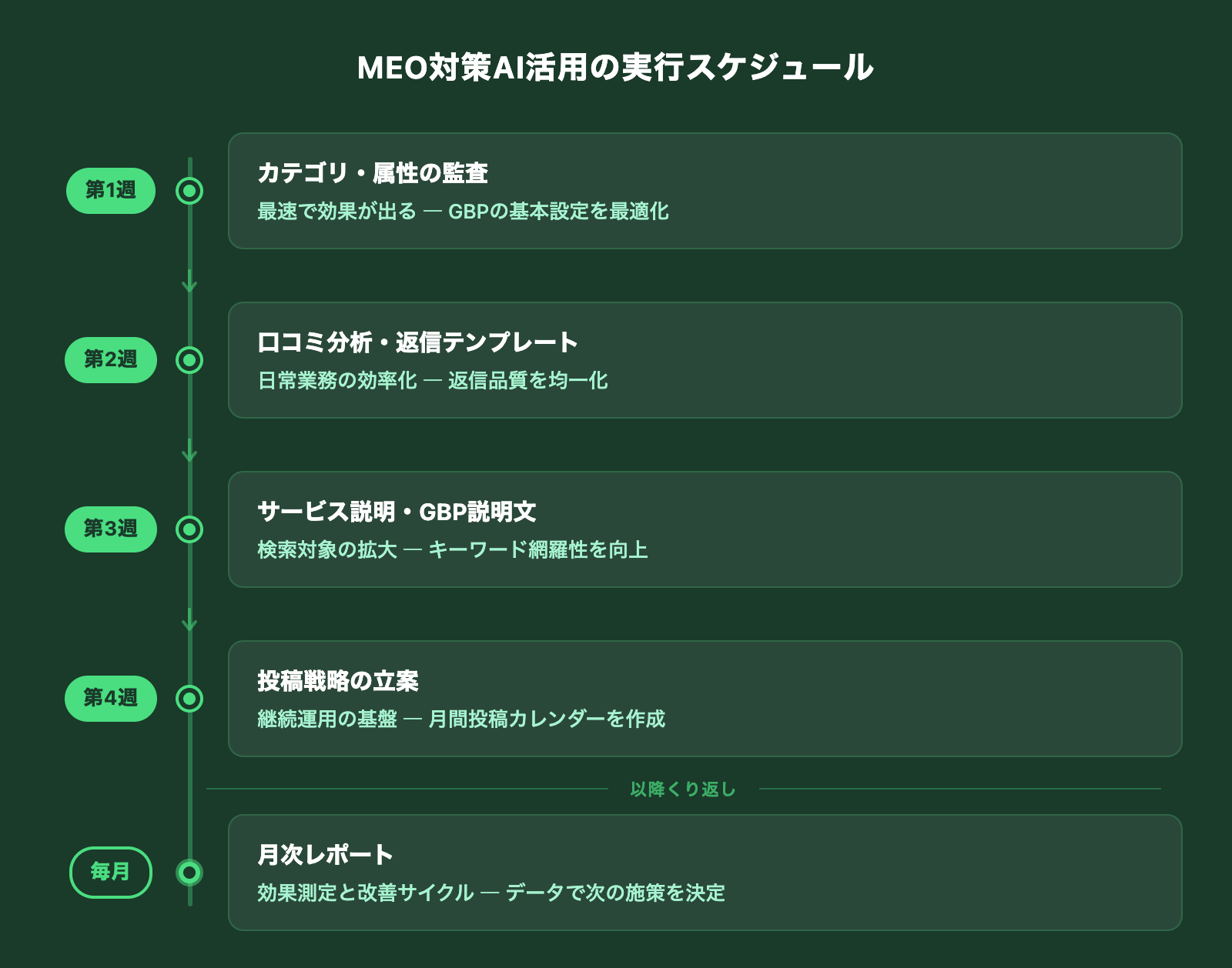 - 撮影すべき写真の指示付きエリア名を含む投稿を継続すると、そのエリアとビジネスの関連性がGoogleに蓄積されます。対象エリアが5つあるなら、8週間で各エリア3〜4回言及する計算です。これは競合が手作業でやろうとすると極めて面倒ですが、AIなら一括で生成できます。