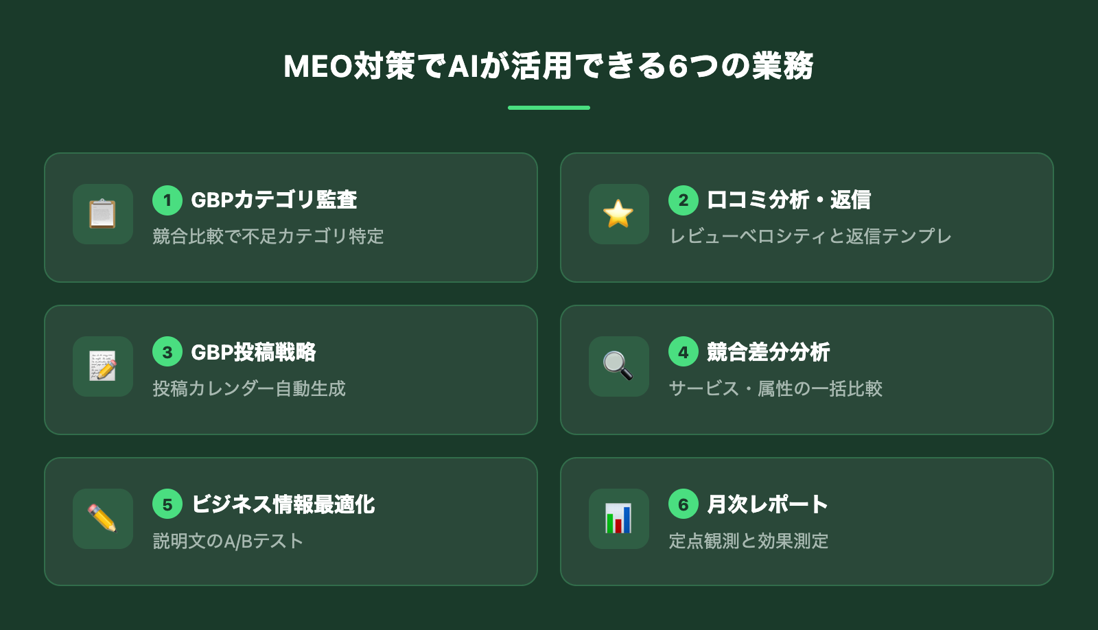 MEO対策の業務は大きく分けて6つあります。このうち、分析・戦略立案・テキスト生成はAIで自動化できる領域です。
