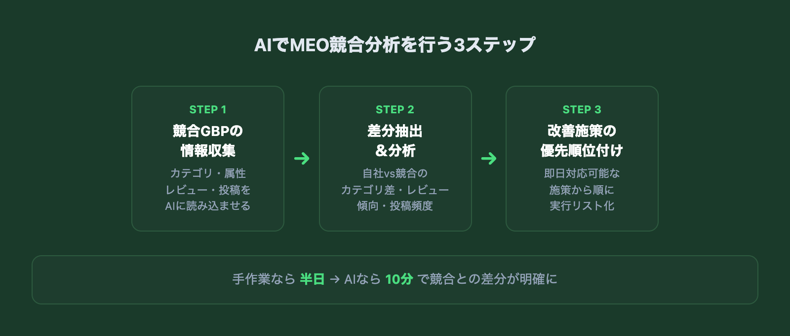 競合のGBPは日々変化します。一度の分析で満足せず、月に1回は競合の状況を確認する習慣をつけましょう。前回の分析結果をAIに読ませて「前回との変化点を教えて」と指示すれば、差分だけを効率的に把握できます。