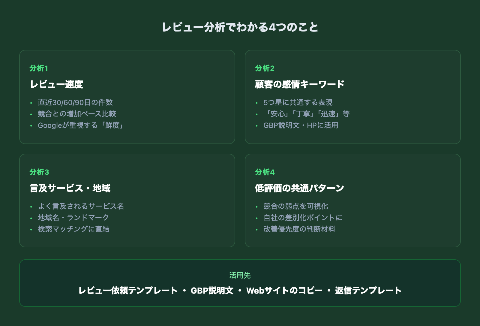 Googleは口コミへの返信がランキングに影響すると公式に認めています。競合の返信パターンをAIに分析させた上で、自社用の返信テンプレートを作りましょう。