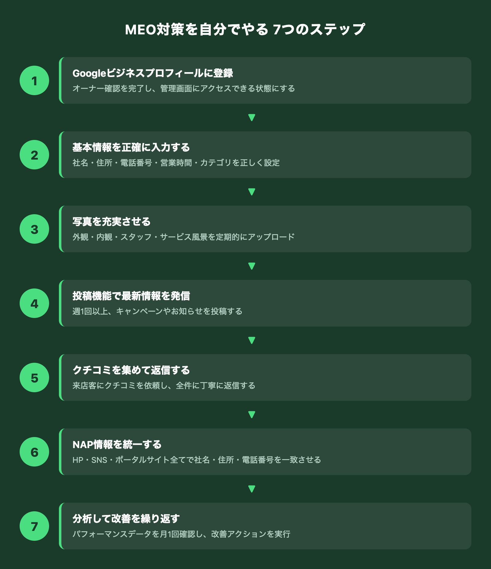 以下の7ステップを順番に実践すれば、業者に頼まなくてもMEO対策の基本は完了します。