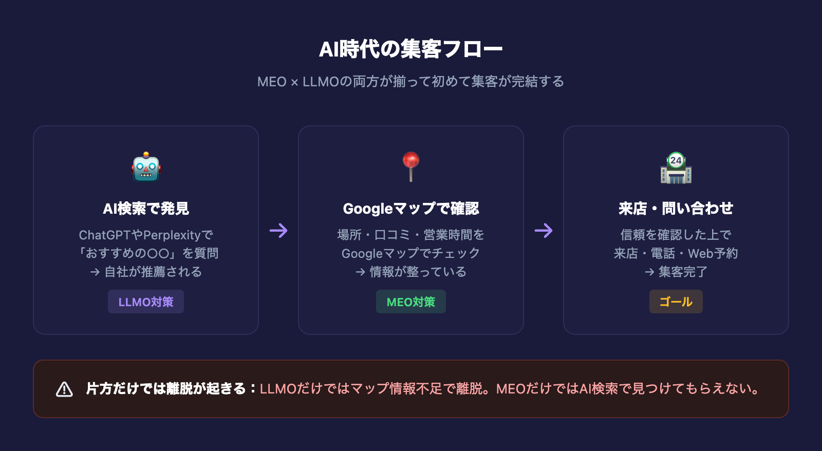 つまり、集客の流れは「AI検索で興味を持つ → Googleマップで確認する → 来店・問い合わせ」という連鎖になりつつあります。どちらか一方だけを対策しても、この流れの途中で離脱が起きてしまうのです。