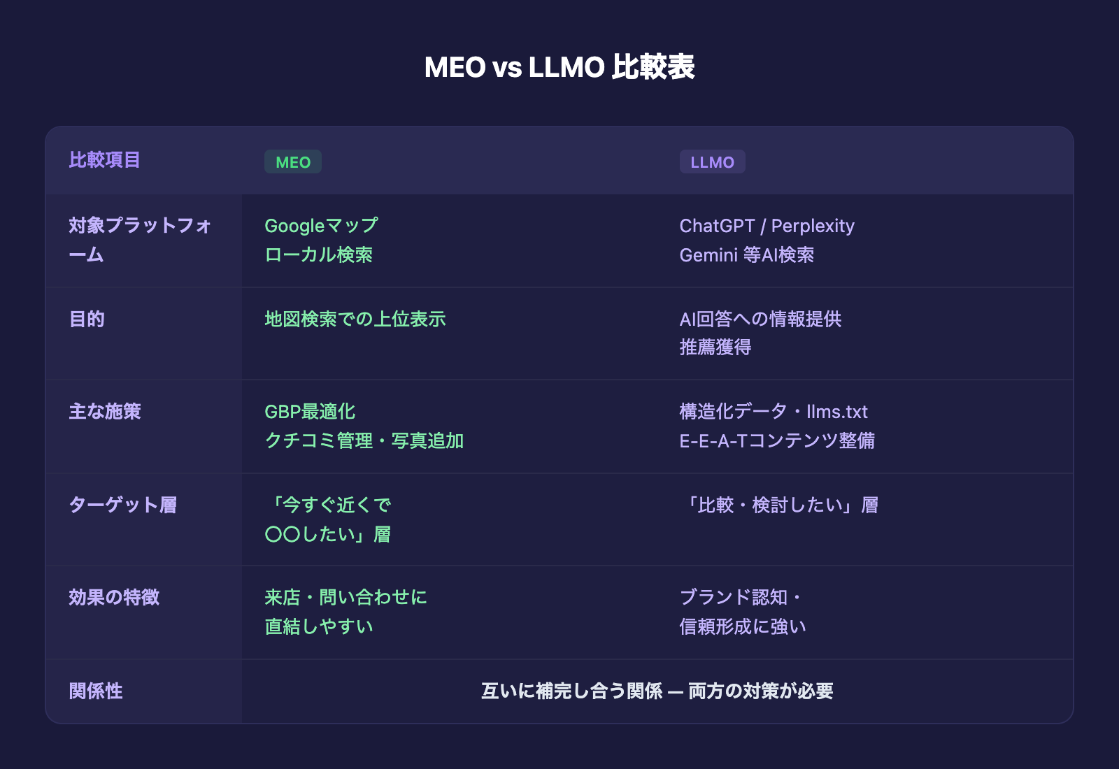 MEOが「地図上での存在感」を高めるものだとすれば、LLMOは「AI会話の中での存在感」を高めるものと言えます。