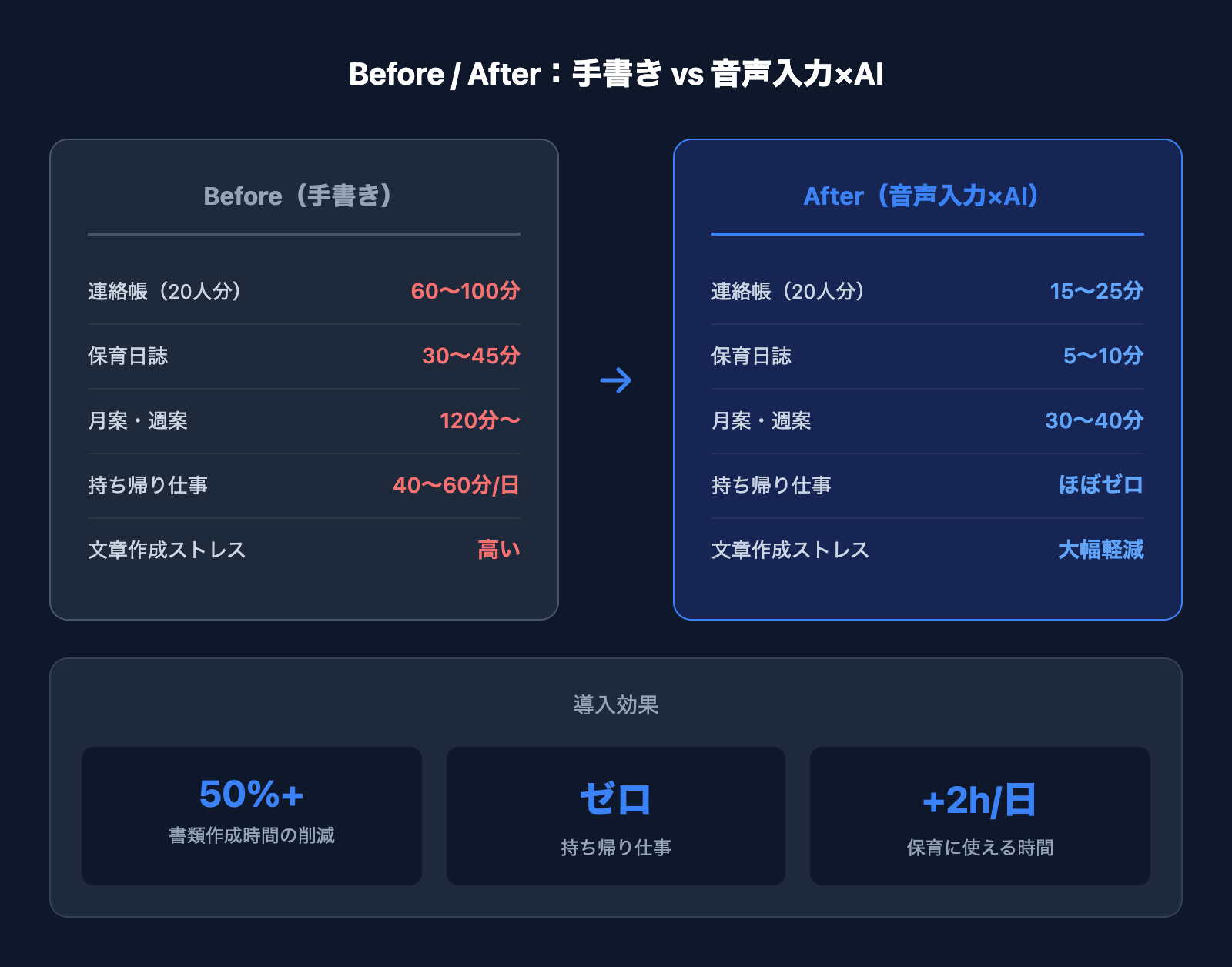 私たちが介護施設で実現し、幼稚園にも導入した経験をもとに、保育園にも展開しているのが「音声入力×AI自動文章化」の仕組みです。
