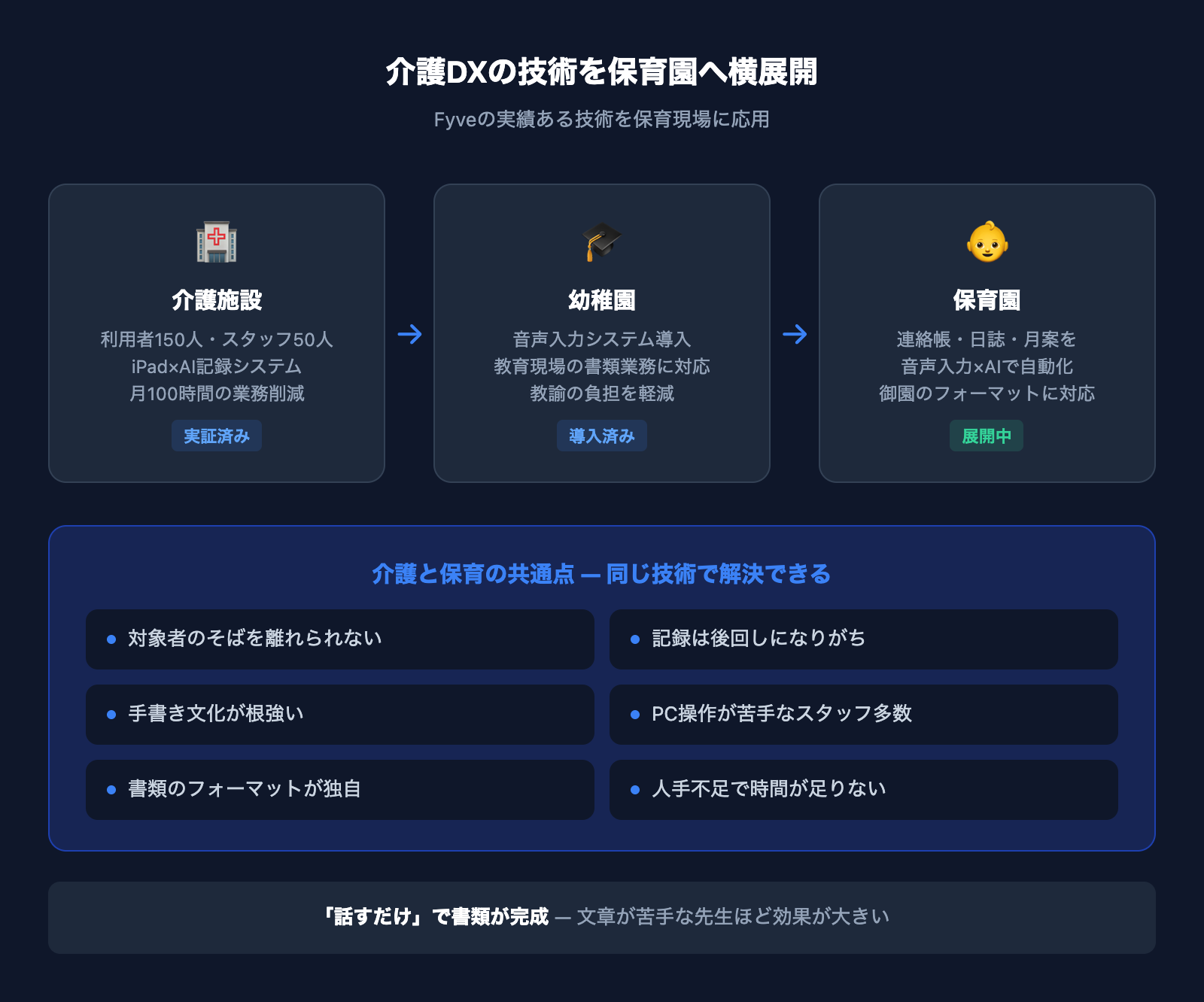 株式会社Fyve代表の田嶋です。私たちは介護施設向けにiPad×AI記録システムを開発し、月100時間の業務削減を実現しました。さらに幼稚園でも音声入力システムを導入した経験があります。その中で気づいたのは、介護と保育の現場には驚くほど共通点があるということ。「利用者・園児のそばにいたいのに、書類が引き離す」——この構造は全く同じです。
