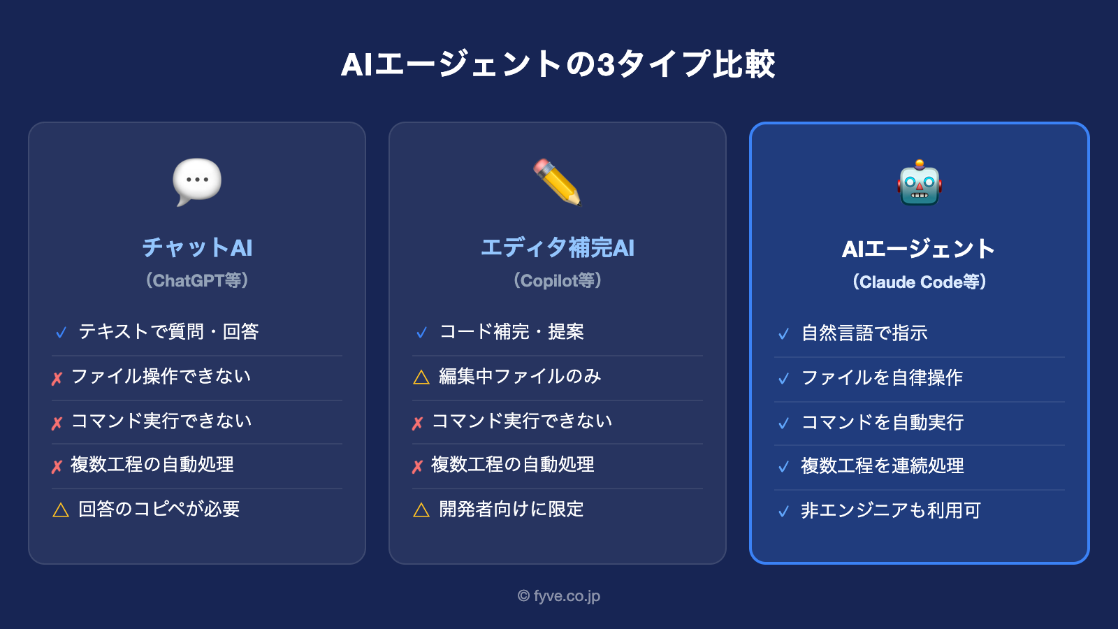 一方、現在メインで使っているClaude Code(Anthropic社のAIエージェント)は違います。自分でファイルを開いて、編集して、保存して、次の作業に進むのです。人間が「提案書を作って」と指示すれば、ファイルの作成から内容の記述、フォーマットの調整まで一連の工程を自律的に進めます。