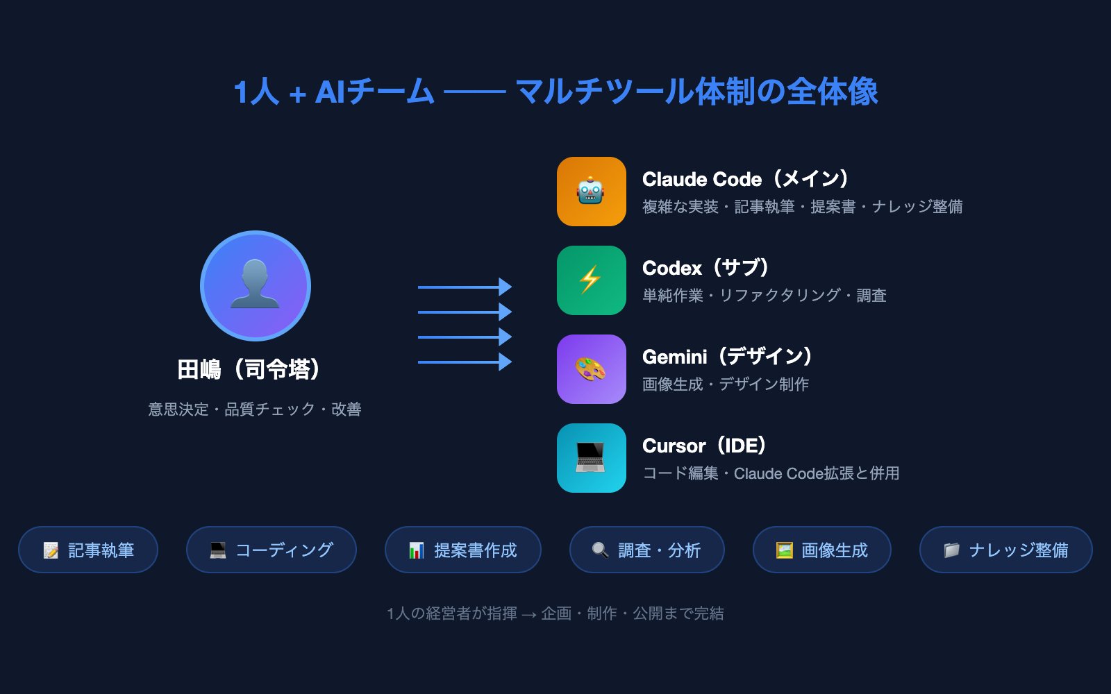 私の場合、この体制により、コーディング・記事執筆・提案書作成・調査・画像生成・ナレッジ整備まで、ビジネスのほぼ全範囲を1人+AIチームでカバーしています。