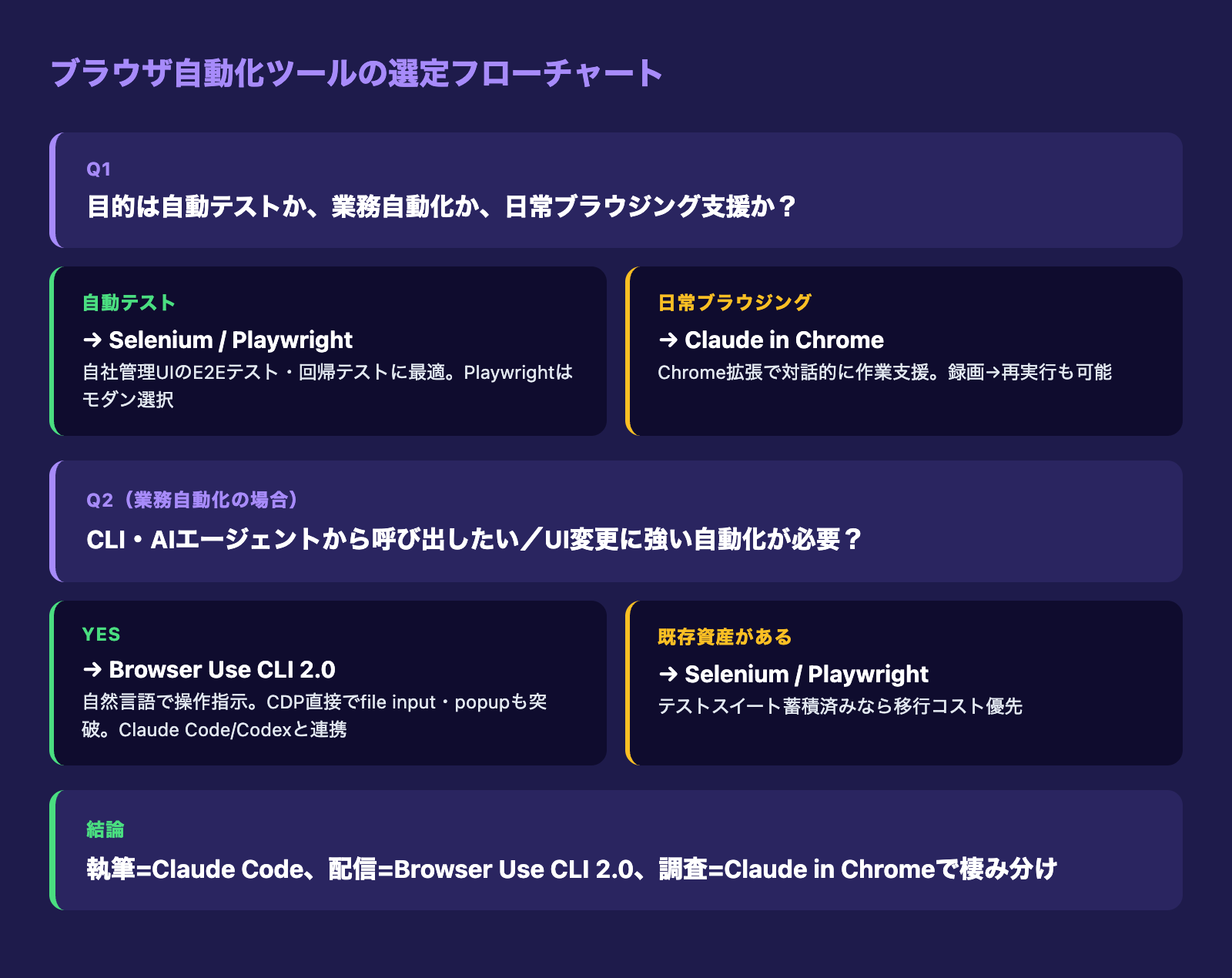 言い換えると、Claude in Chromeは「ブラウザの中で使うAI」、Browser Use CLI 2.0は「AIから使うブラウザ」です。私の整理では両者は競合ではなく、役割分担の関係にあります。