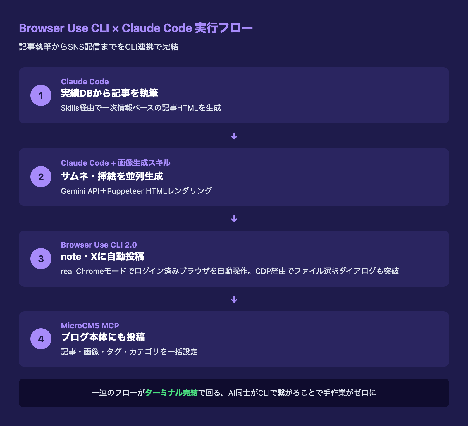 私の運用では、Claude Codeで記事を書く → Browser Use CLIでnote・Xに投稿する、という流れを1つのスキルにまとめています。AI同士がブラウザ自動化で繋がることで、記事の執筆から配信までの一連のフローがCLIだけで完結します。