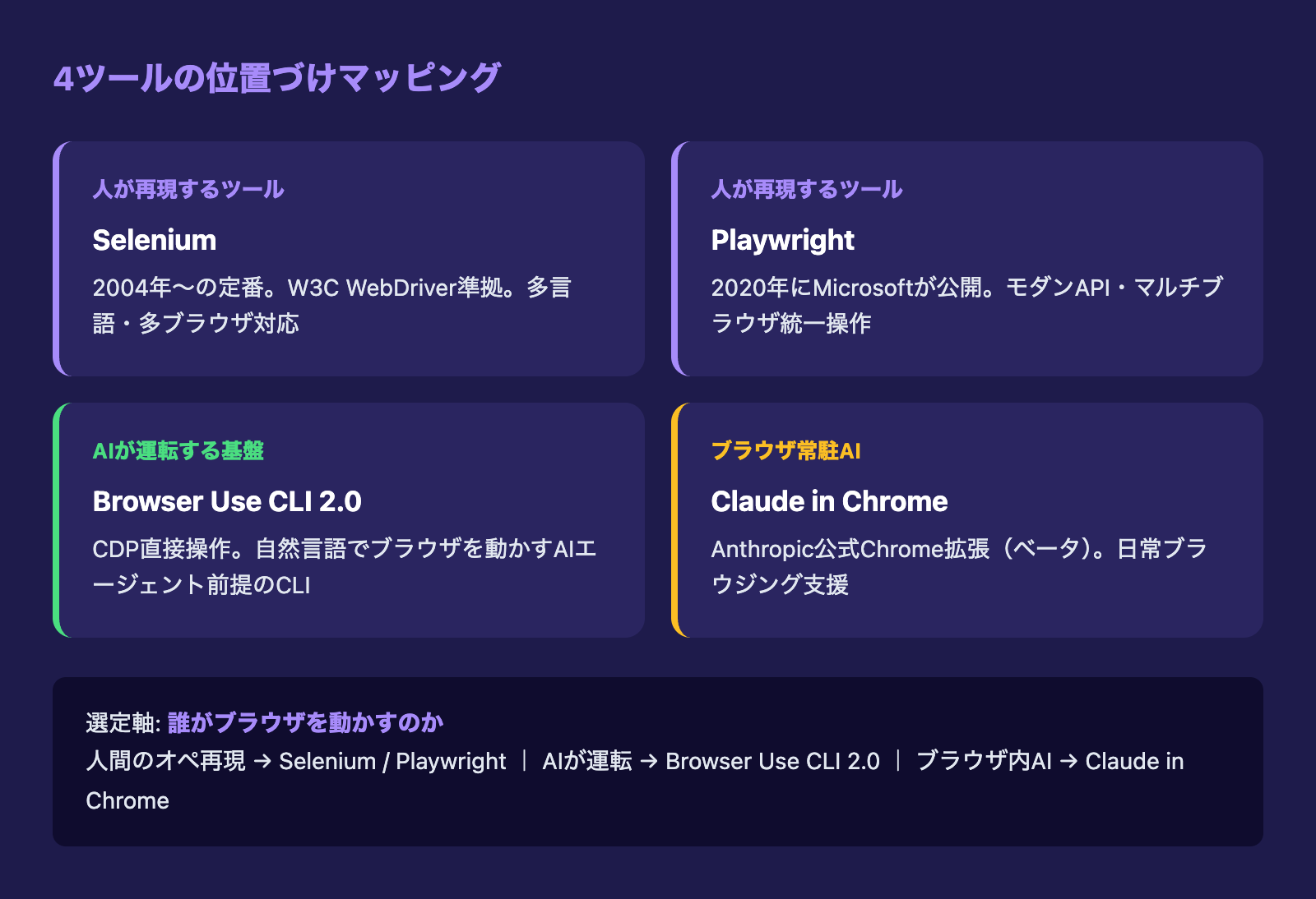Selenium・Playwrightが「人間のオペレーションをコードで再現するツール」なのに対し、Browser Use CLIは「AIがブラウザを運転するための基盤」、Claude in Chromeは「手元のChromeに常駐するAIアシスタント」です。この前提を踏まえずに比較すると、どのツールを選んでも使いこなせません。