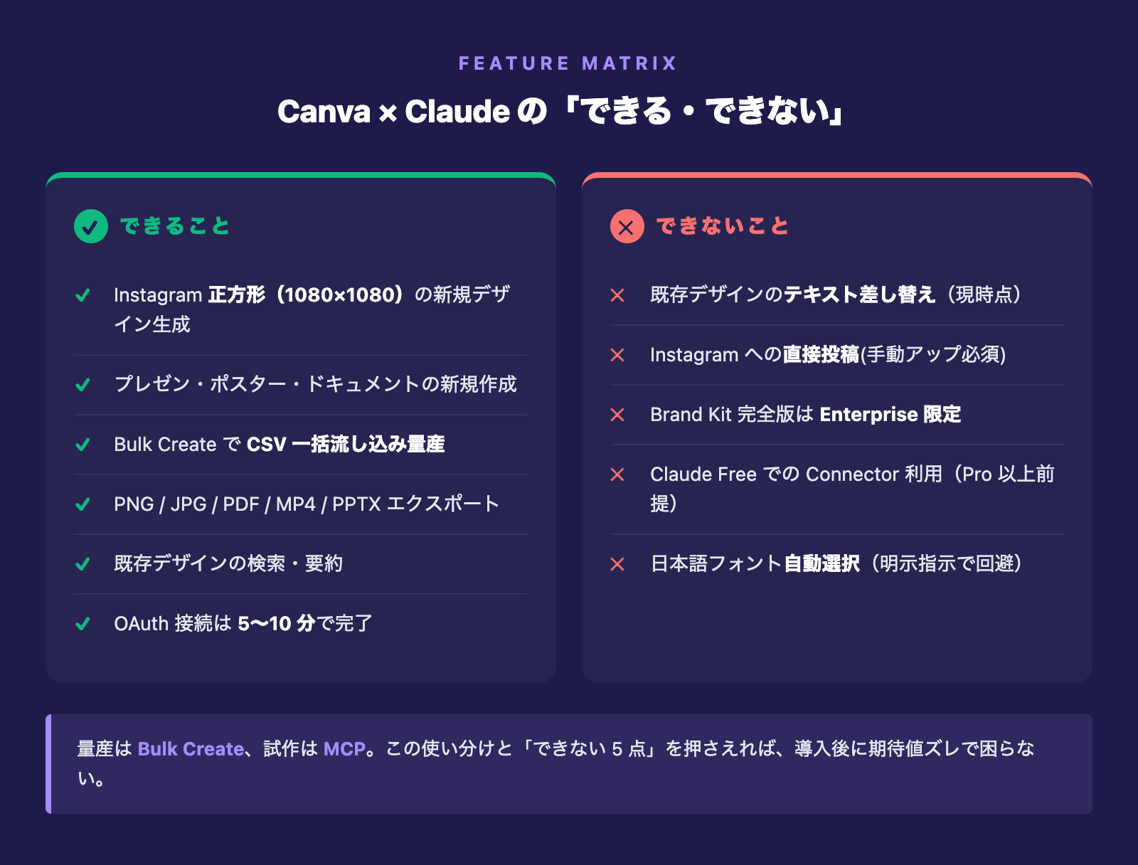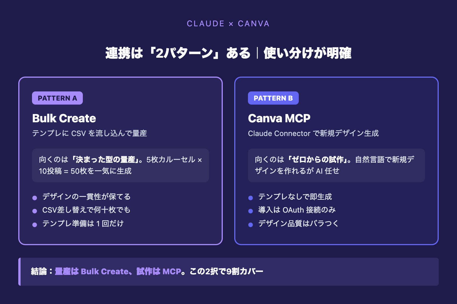 結論は「量産はBulk Create、試作はMCP」の一言に尽きます。この使い分けを押さえれば、Claude×Canva連携の大半は回せます。
