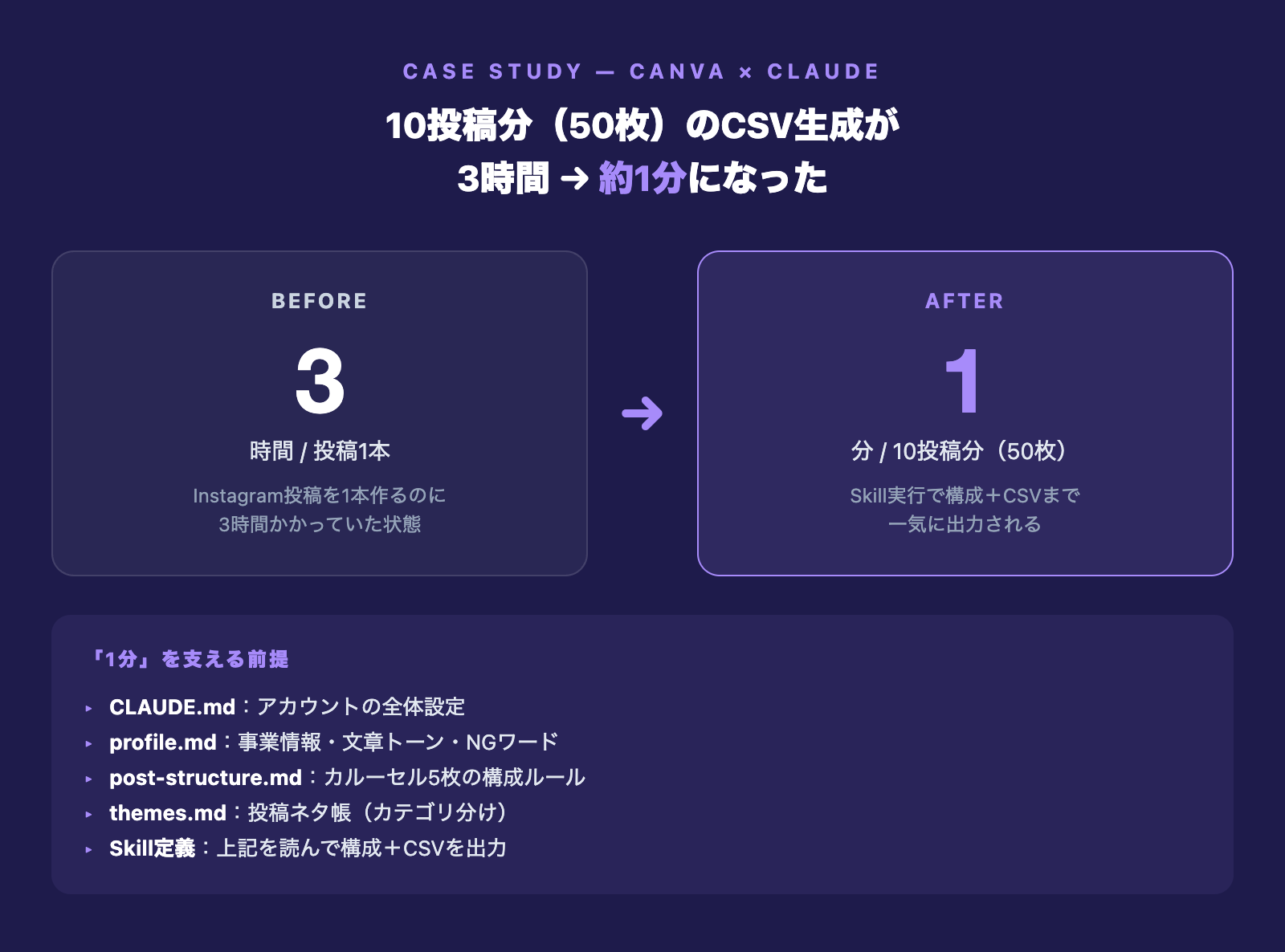 そして見落としがちなのが、Canva連携単体では時間短縮の効果は限定的ということ。事業情報・トーン・構成ルールをファイルとしてClaudeに覚えさせ、Skillで出力まで自動化する土台がそろって初めて「10投稿分を1分」の世界に届きます。