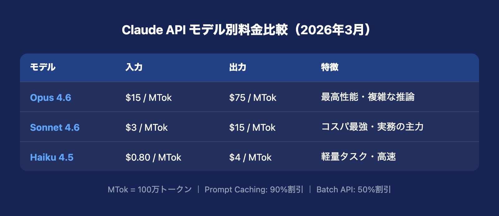 2026年のClaude APIモデル別料金一覧