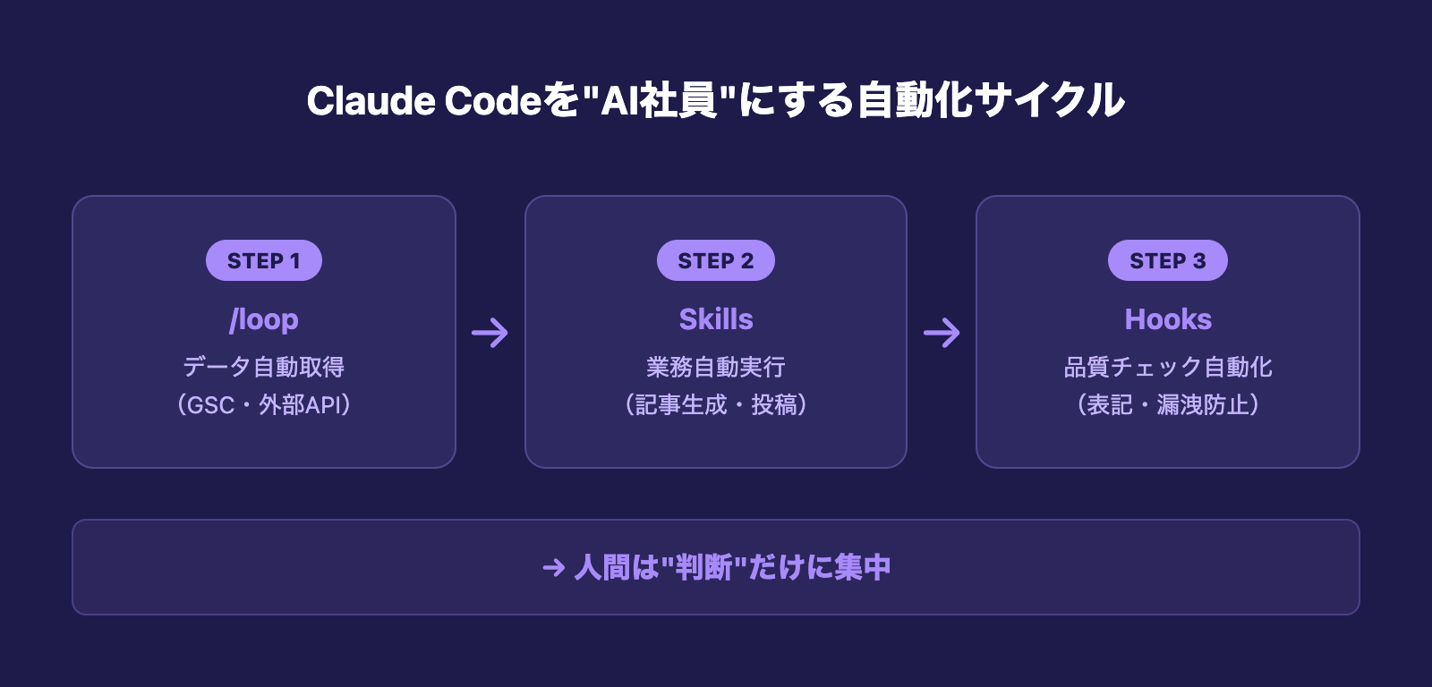 Claude Codeを"AI社員"にするために必要なのは、特別な技術ではなく「繰り返す業務を見つけてSkill化→Hooksで品質を担保→/loopで定期実行」というサイクルを回すことです。