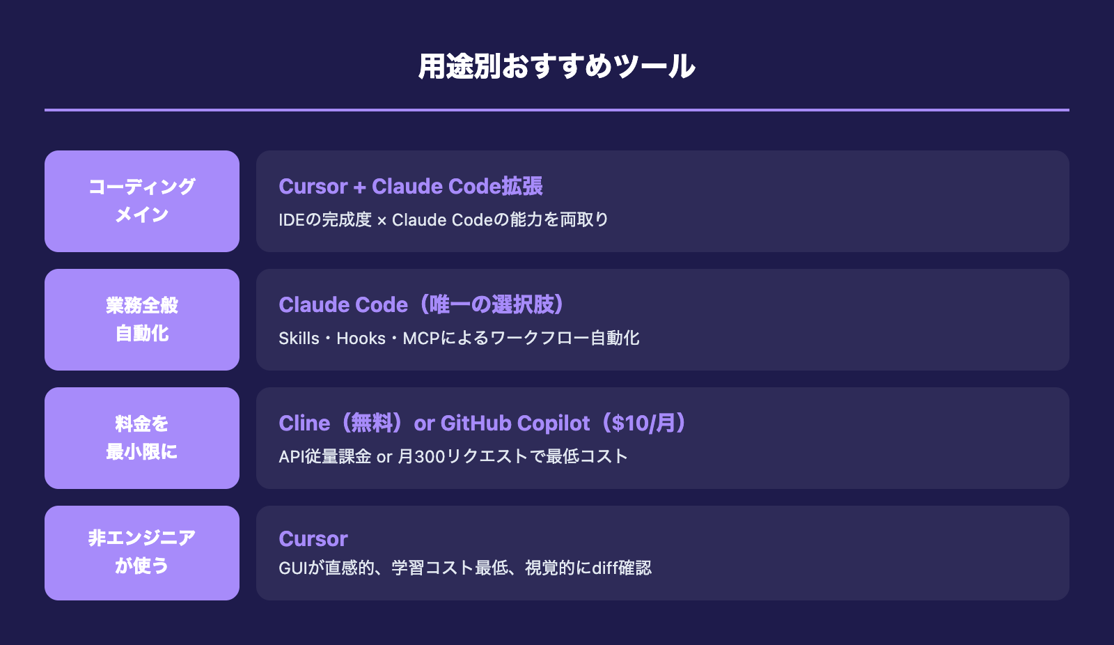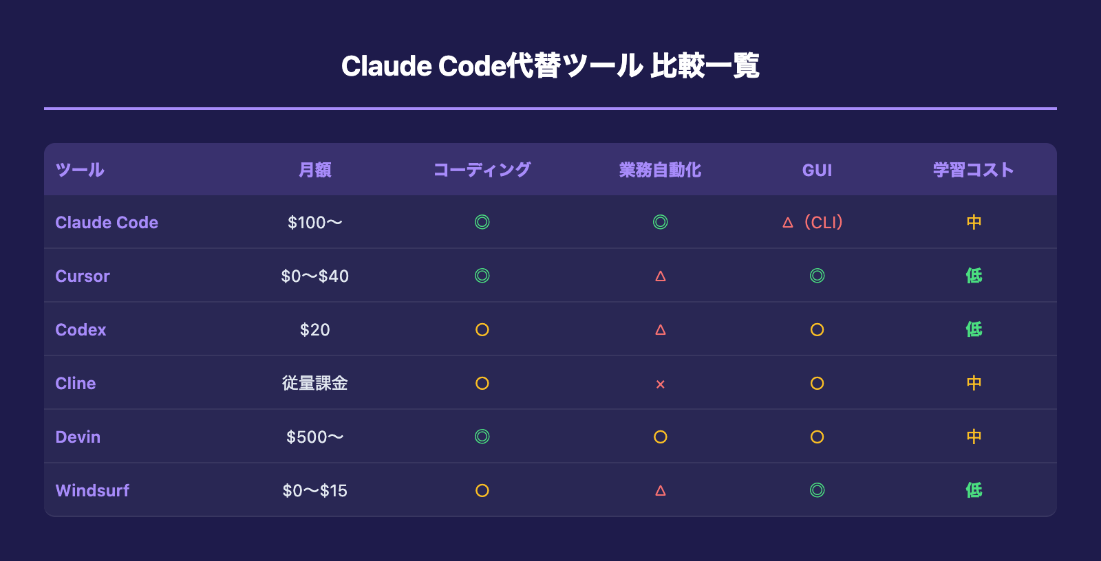 - Cursor: IDE統合・GUI重視ならClaude Codeと併用が最適
