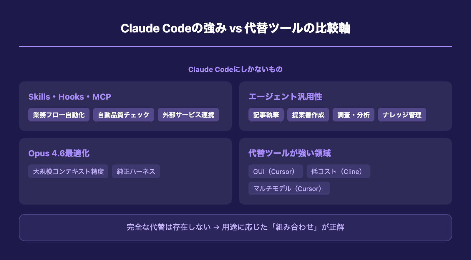 Claude Codeの代替ツールを探している方へのアドバイスは、「完全な代替」を求めるより「組み合わせ」で考える方が現実的ということです。